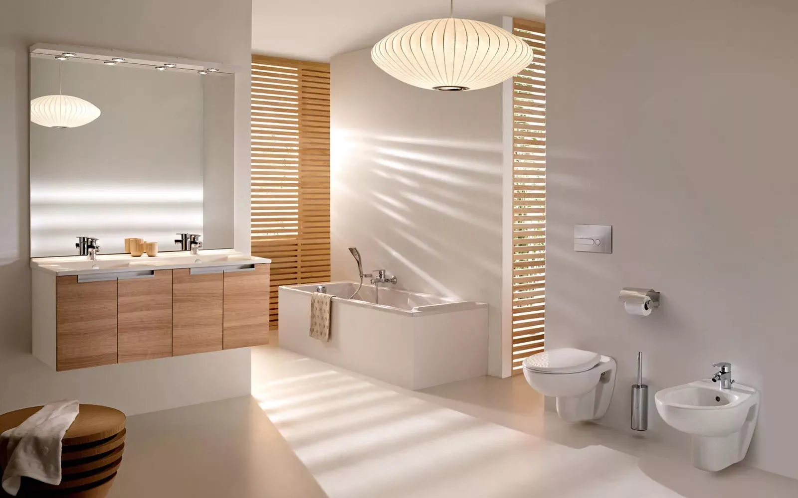 Среди них фарфоровые унитазы, раковины с широкими краями для одной и двух чаш, стеклянные шторки для ванн, тумбы, навесные шкафы и зеркала.