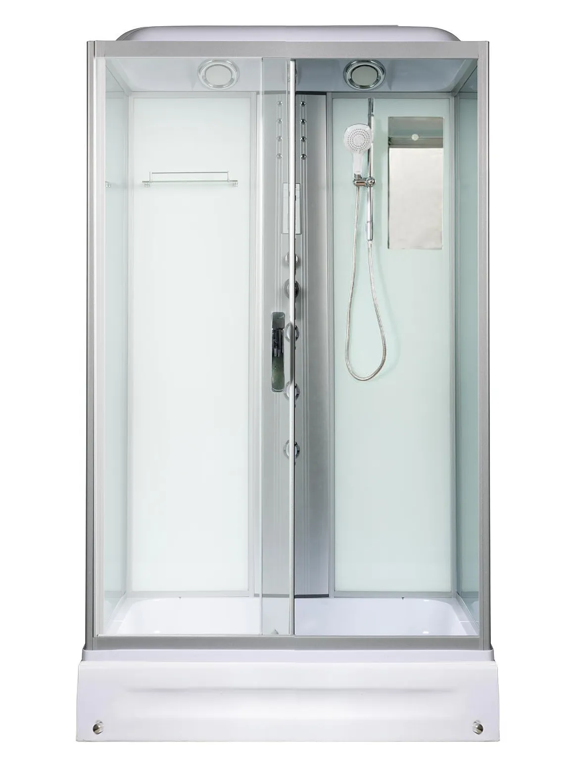 | Оснащение | Душевая кабина / крыша / верхний душ / динамик / вентиляция / пульт / радио / смеситель / душевая штанга / душевая лейка / душевой шланг / полочка |