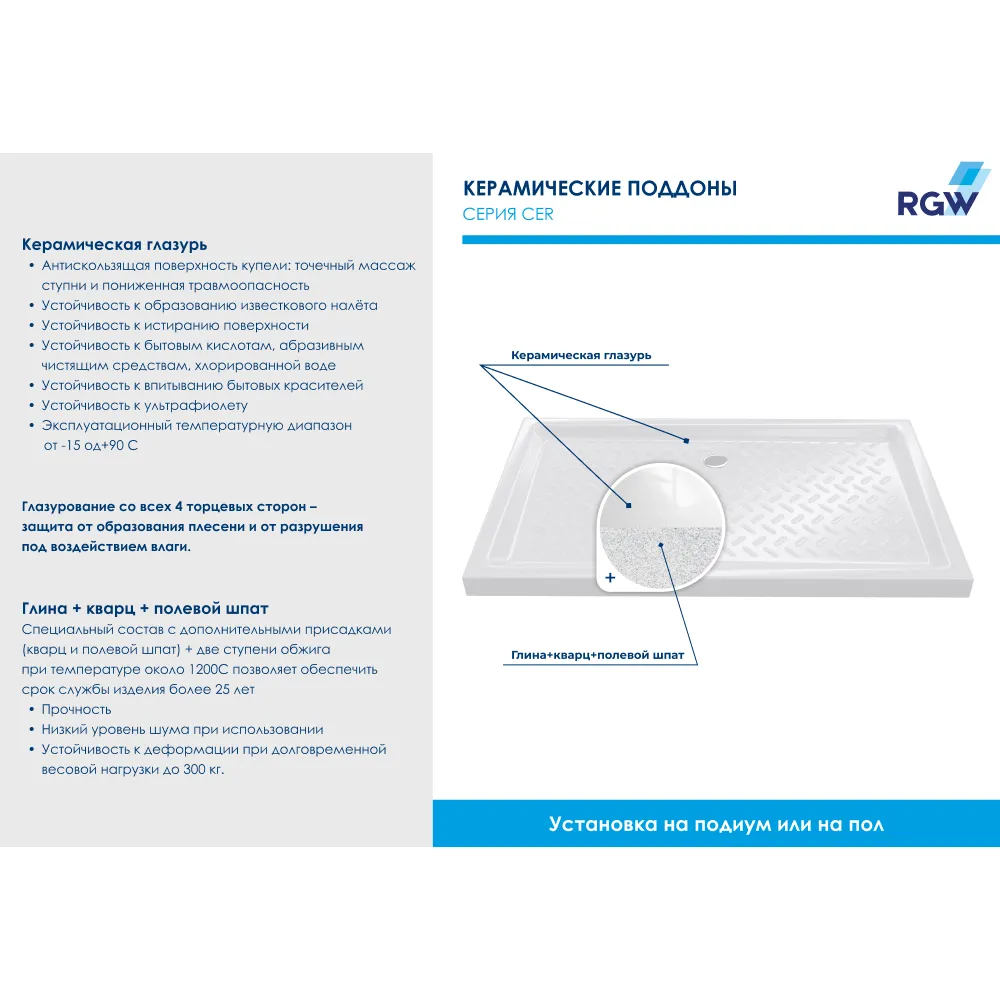 Компания RGW — крупный производитель душевых кабин, дверей, перегородок, углов, а также поддоны, душевые панели и стойки, встраиваемые души и душевые системы, фурнитуру для душевых ограждений. Вся продукция сертифицирована. Она соответствует Евро и Росстандартам, технологическим и эксплуатационным нормам. На сегодняшний день в России работают 3 фабрики RGW. Компания располагает собственным складским комплексом площадью более 10 000 кв. м, а также автопарком для организации доставки. Компания RGW - Стильные Душевые основана в 1997 году и успешно работает в России более 26 лет. Ресурс службы изделий — от 15 лет. По этому показателю RGW - Стильные Душевые находится среди лидеров рынка.