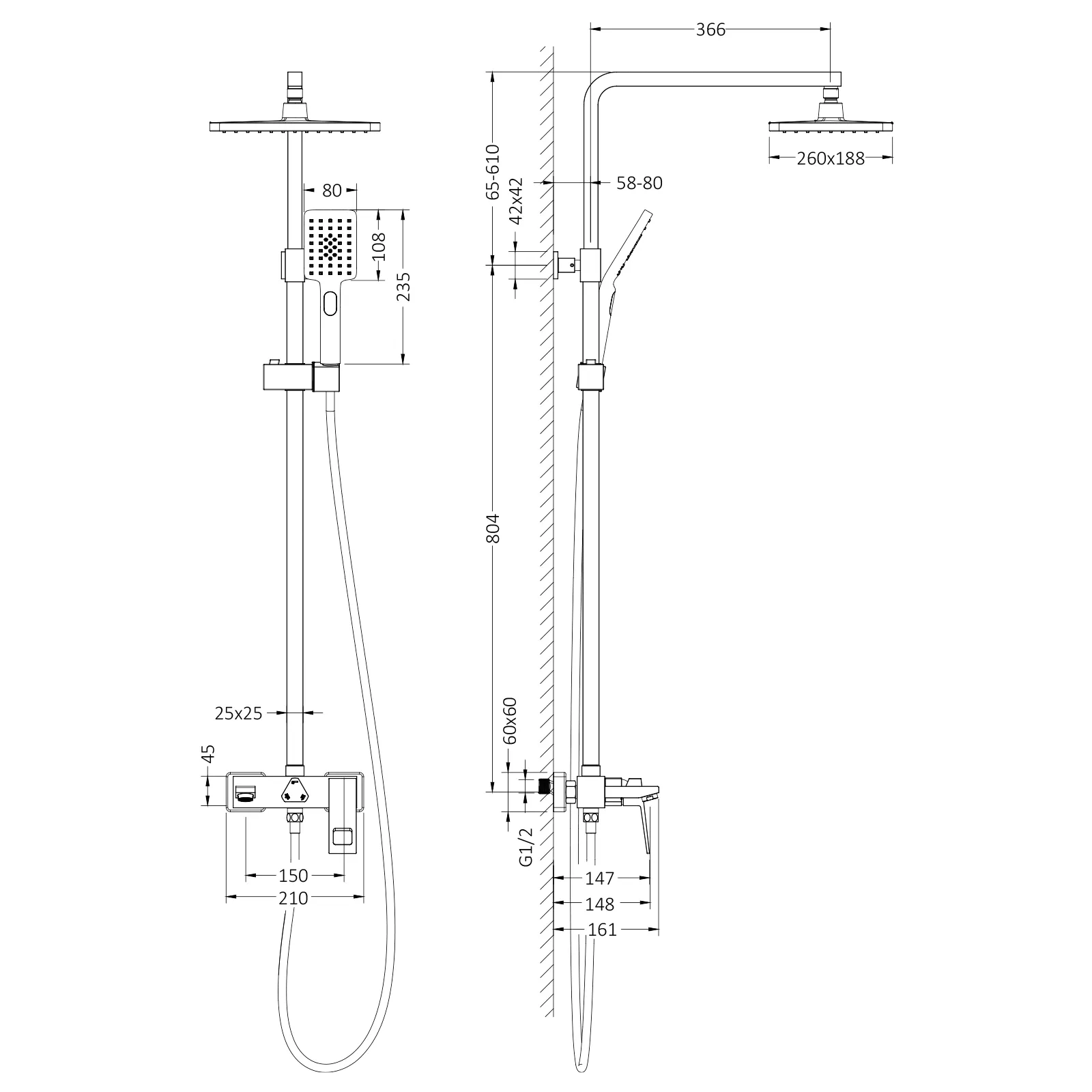 | Оснащение | смеситель / верхний душ / душевая штанга / держатель для душевой лейки / душевая лейка / душевой шланг |