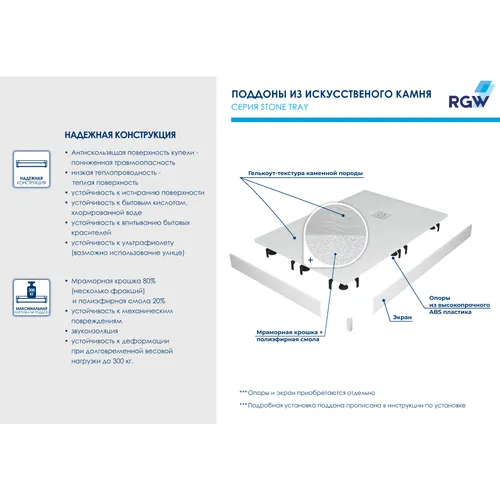 Компания RGW — крупный производитель душевых кабин, дверей, перегородок, углов, а также поддоны, душевые панели и стойки, встраиваемые души и душевые системы, фурнитуру для душевых ограждений. Вся продукция сертифицирована. Она соответствует Евро и Росстандартам, технологическим и эксплуатационным нормам. На сегодняшний день в России работают 3 фабрики RGW. Компания располагает собственным складским комплексом площадью более 10 000 кв. м, а также автопарком для организации доставки. Компания RGW - Стильные Душевые основана в 1997 году и успешно работает в России более 26 лет. Ресурс службы изделий — от 15 лет. По этому показателю RGW - Стильные Душевые находится среди лидеров рынка.