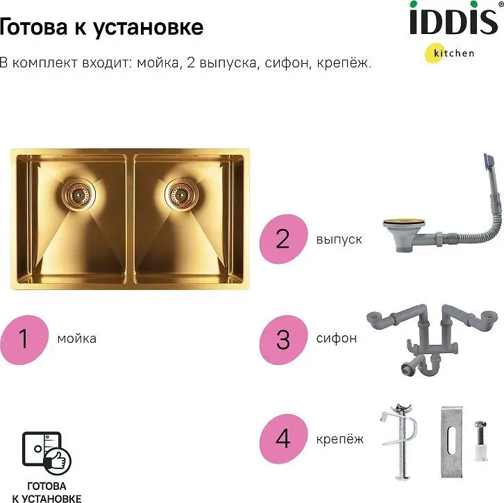 Комплект поставки: мойка, корзинчатый вентиль, сифон, крепления.