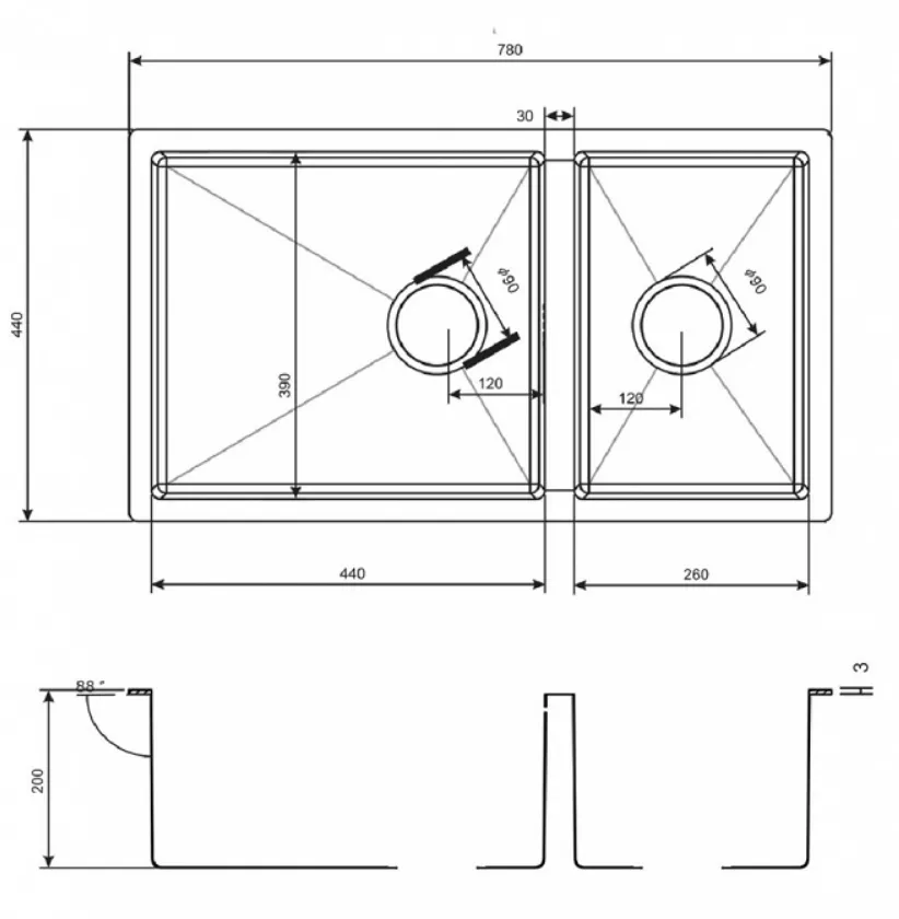 толщина мойки 1,5 мм (бортик мойки 3 мм)
