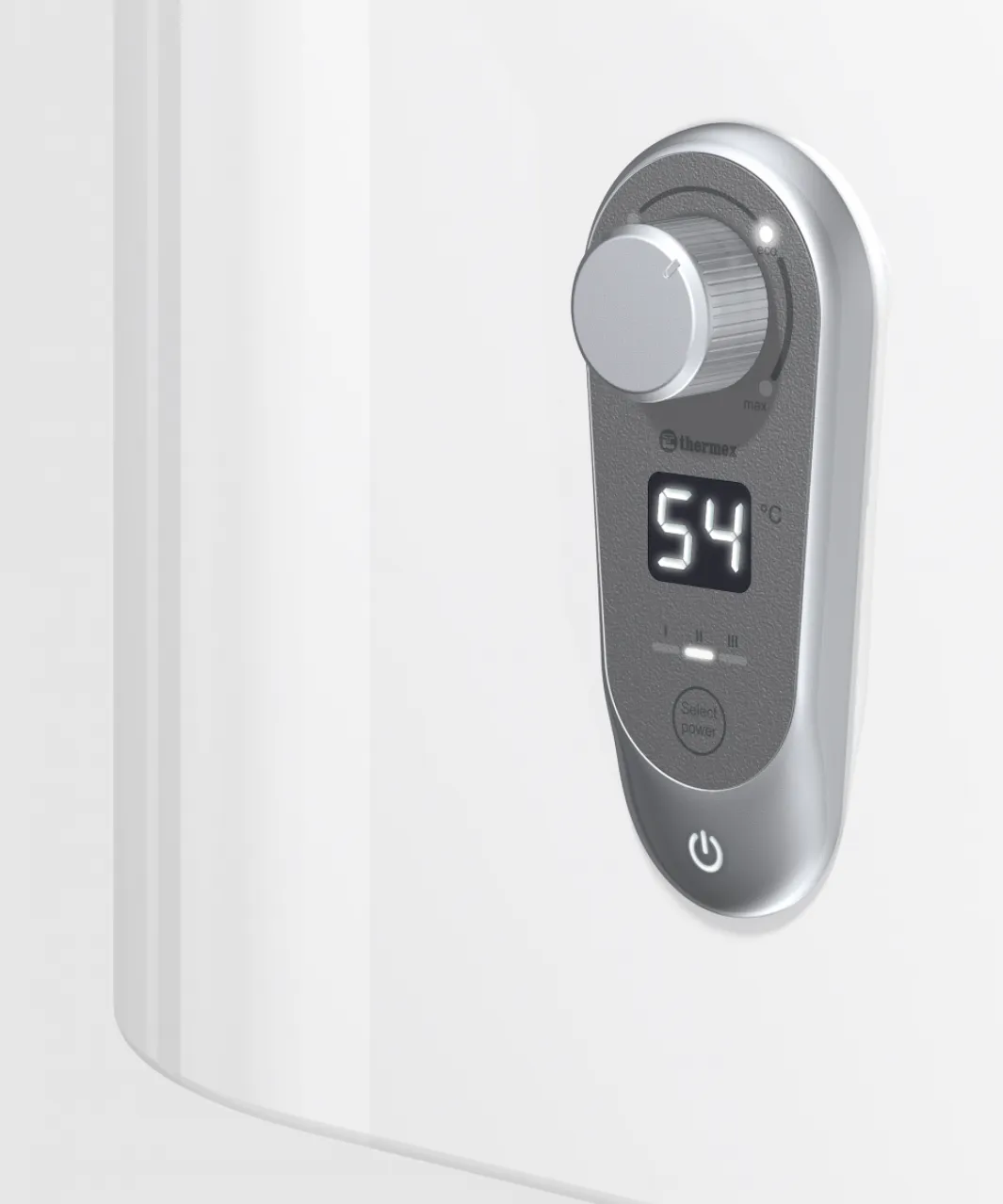 Электронно-механическое управление. На фронтальной стороне водонагревателя расположена панель управления из механического регулятора нагрева, кнопка регулировка мощности и дисплей с отображением температуры.