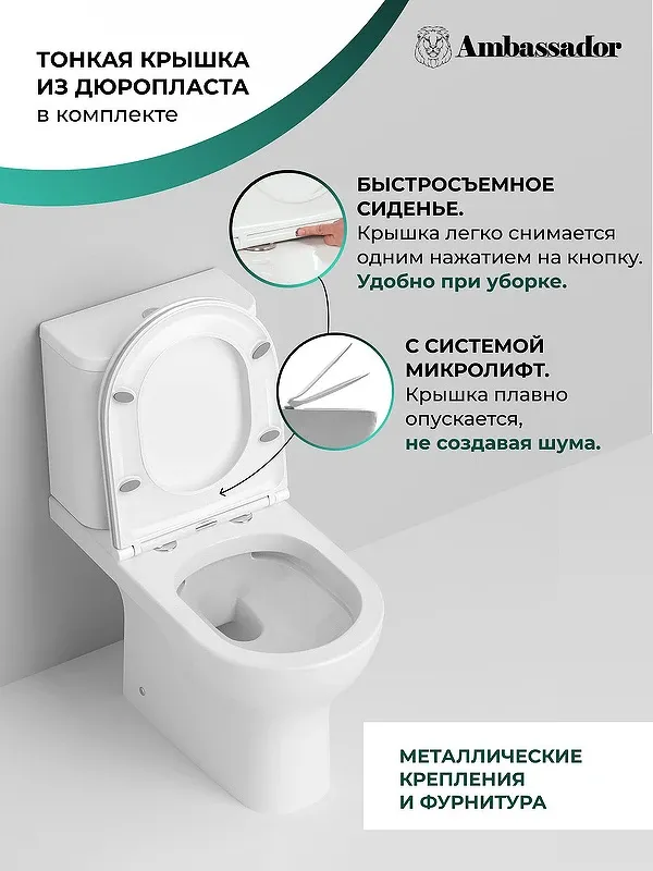 <p><strong>Унитаз-компакт Ambassador Abner 107K19001RS напольный безободковый с микролифтом<br /><br /></strong><strong>Бренд:</strong> Ambassador<br /><strong>Артикул:</strong> 107K19001RS<br /><br />Унитаз Abner 107K19001RS (670*360*780) с бачком и тонким сиденьем из дюропласта - идеальное решение для вашей ванной комнаты. Благодаря системе микролифт, крышка плавно опускается без шума и микротрещин на ободке унитаза. Удобное быстросъемное сиденье можно легко снять одним нажатием кнопки, экономя время при уборке.</p>