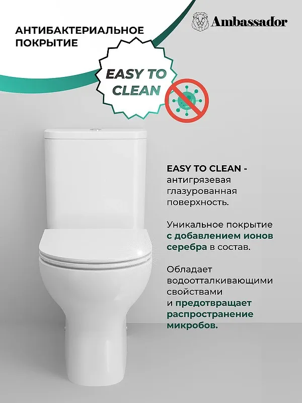 <p>Поверхность унитаза имеет антигрязевое глазурованное покрытие Easy to clean, которое содержит ионы серебра. Это покрытие обладает водоотталкивающими свойствами и предотвращает рост микробов, облегчая процесс уборки и поддерживая высокий уровень гигиены в вашей ванной комнате.</p>