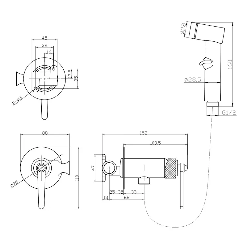 | Оснащение | смеситель / душевая лейка / держатель для душевой лейки / душевой шланг |