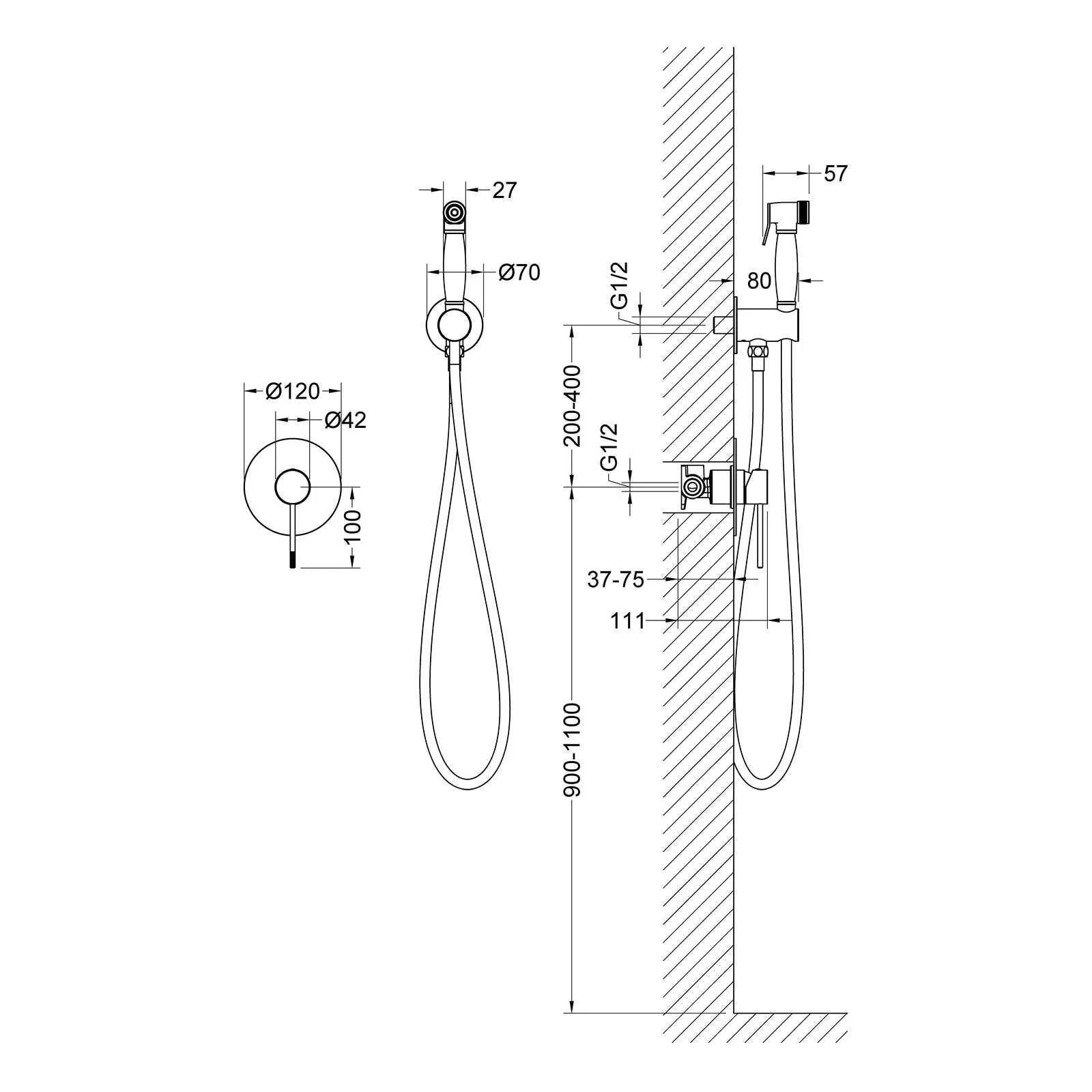 | Оснащение | смеситель / душевая лейка / душевой шланг / настенный держатель |