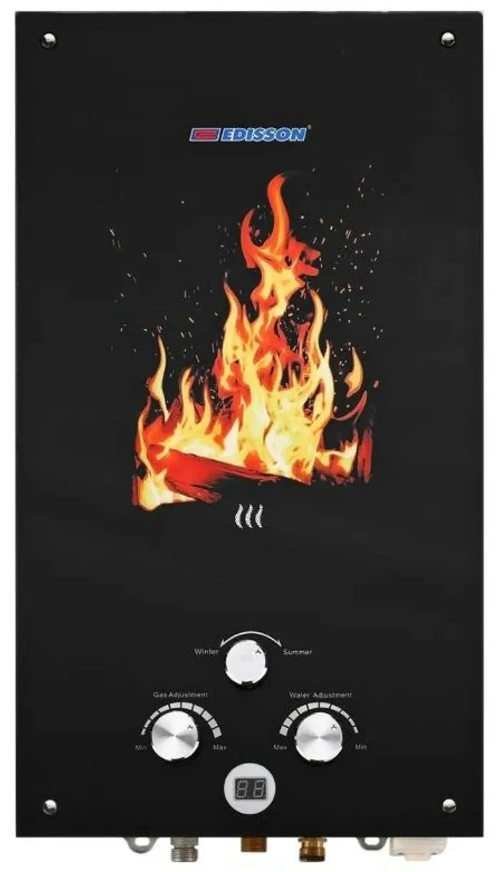Газовая колонка EDISSON (Эдиссон) F 20 GD (Костер) – это функциональный, безопасный, высокопроизводительный и экономичный прибор для подогрева воды, работающий на природном газе. Внешний облик агрегат заслуживает особого внимания: стильный корпус с черной лицевой панелью удачно дополнен «огненным» декором. Такое дизайнерское решение станет отличным выбором для современных ванных комнат.