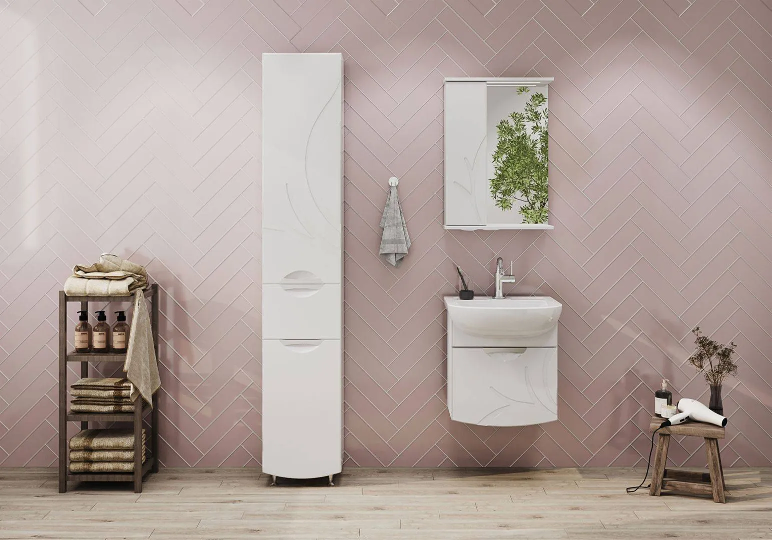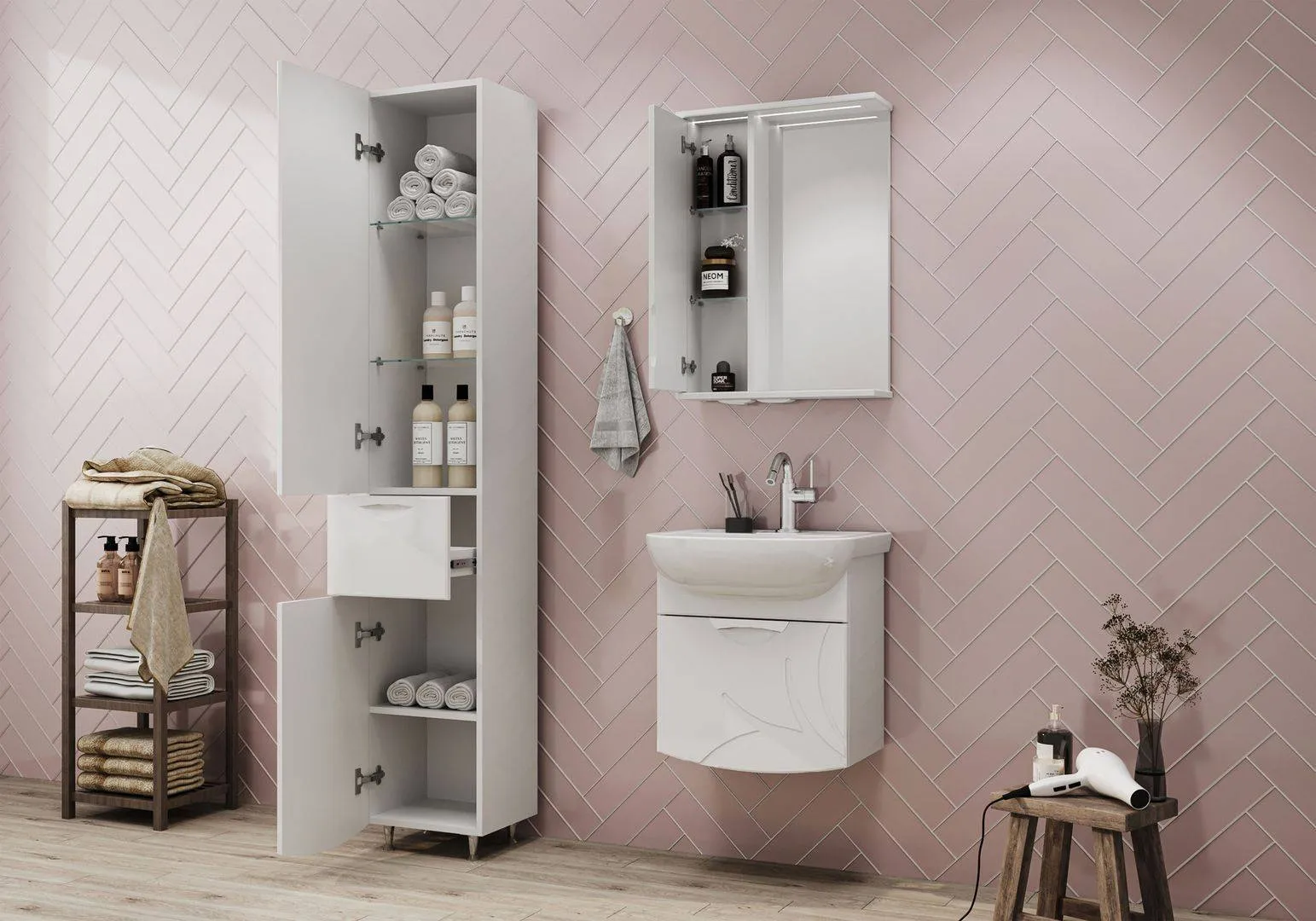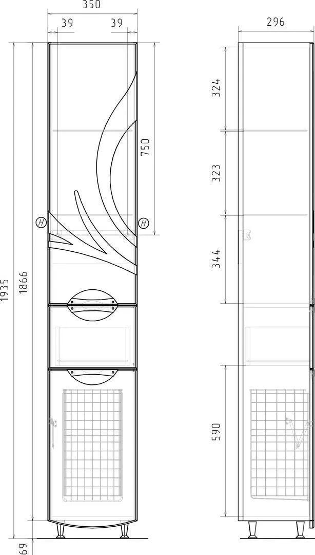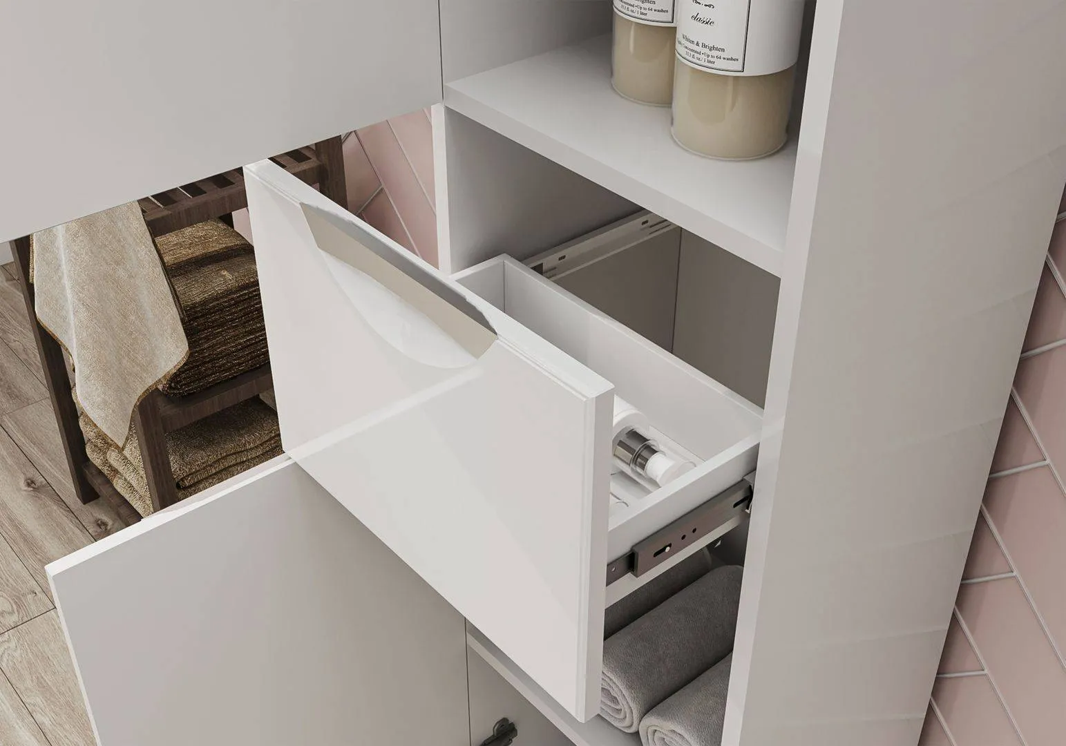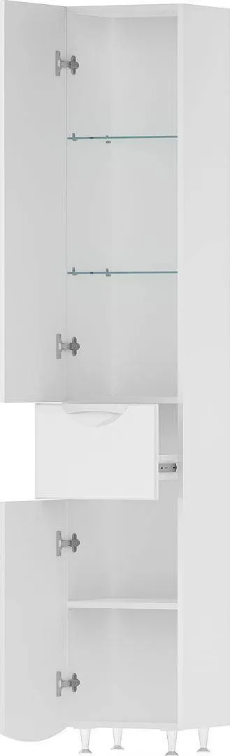 Напольный пенал с двумя стеклянными полками в верхней секции, выдвижным ящиком и одной полкой из ЛДСП в нижней секции. Петли оснащены доводчиками. Дверцы пенала изготовлены из МДФ и облицованы глянцевой пленкой ПВХ. Лицевая фурнитура хром. Пенал устанавливается на четыре регулируемые опоры и фиксируется к стене при помощи креплений. Декоративна фрезеровка на фасаде, фурнитура с доводчиками.