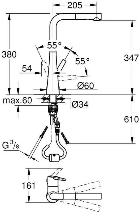Дополнительные функции | регулировка расхода воды, радиус поворота излива 360° |