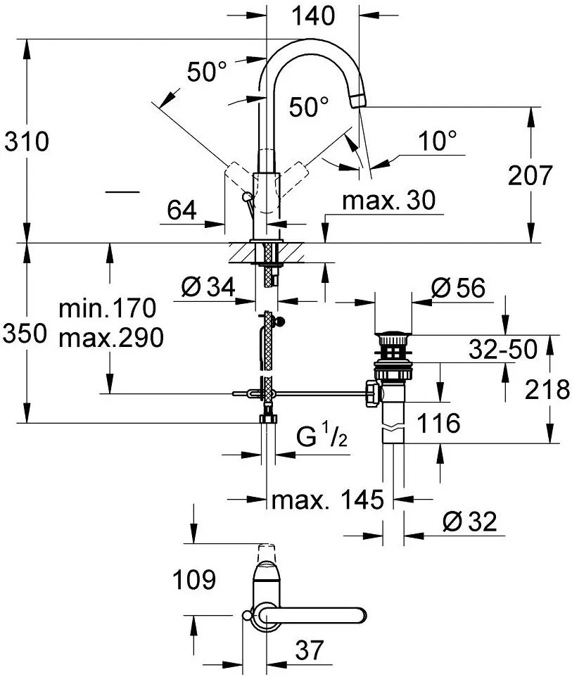 Смеситель Grohe BauCurve 23090000 для раковины с донным клапаном
