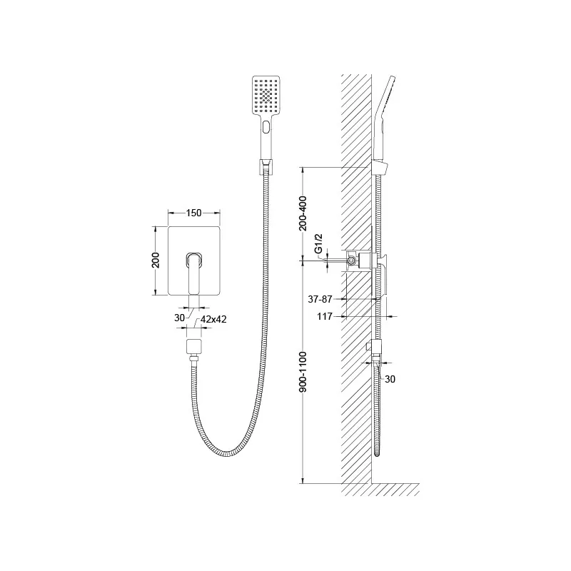 | Оснащение | смеситель / душевая лейка / душевой шланг / настенный держатель |