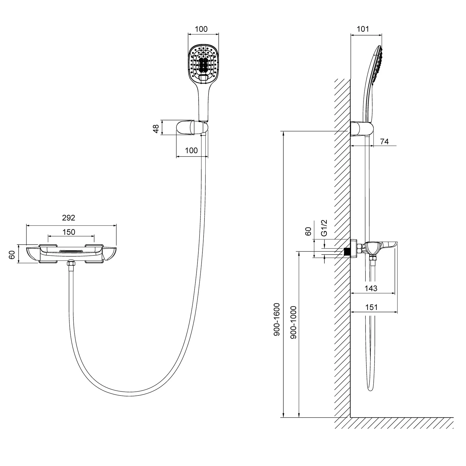 | Оснащение | смеситель / душева лейка / душевой шланг / настенный держатель |