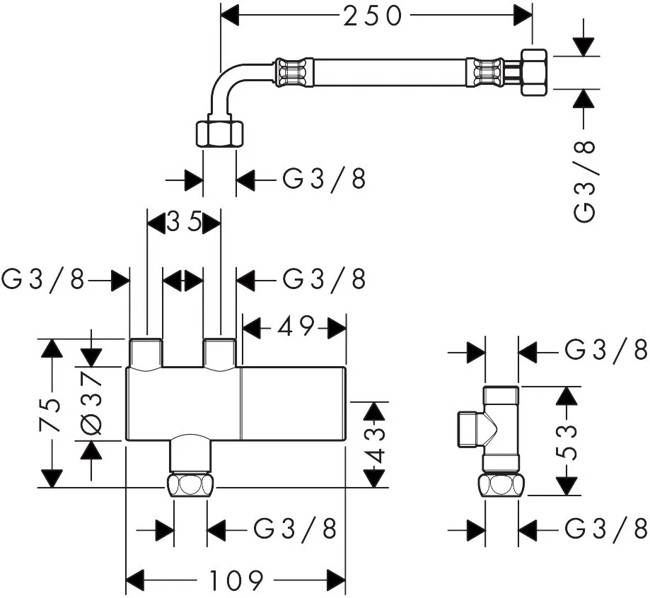 Дополнительная информация | термостат для предварительно смешанной воды, без запорного вентиля, соединительный шланг 250 мм |
