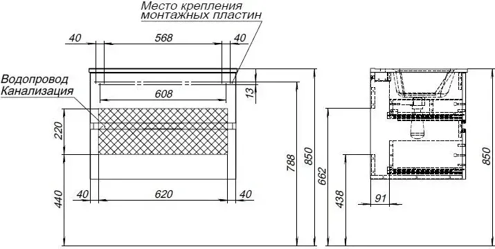 | Подвод труб к тумбе | Посередине |