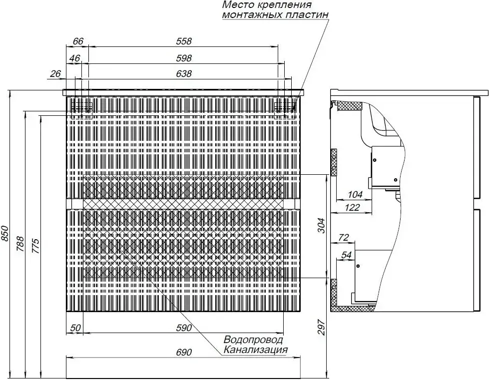 | Подвод труб к тумбе | Посередине |