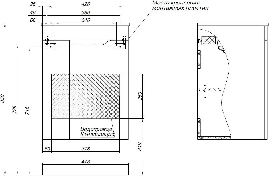 | Подвод труб к тумбе | Посередине |