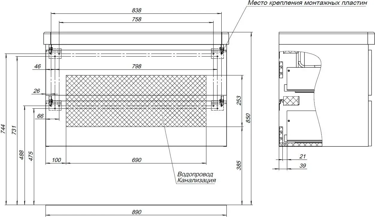 | Подвод труб к тумбе | Посередине |