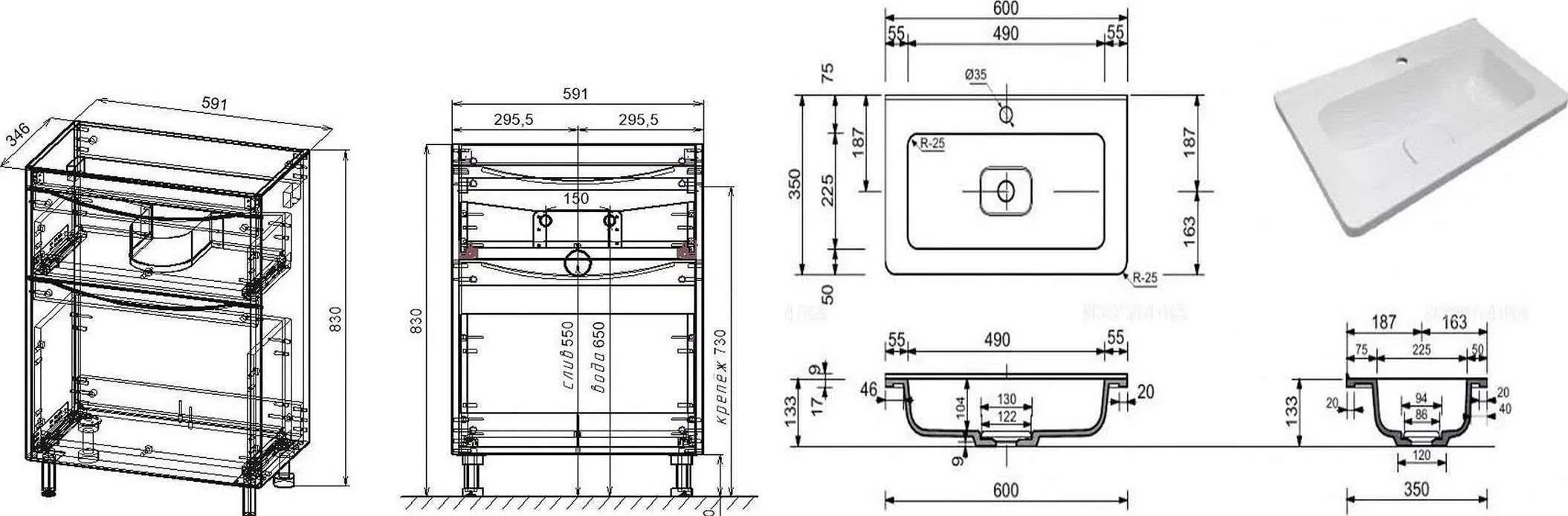 Тумба с раковиной Style Line Бергамо 60 черная напольная
