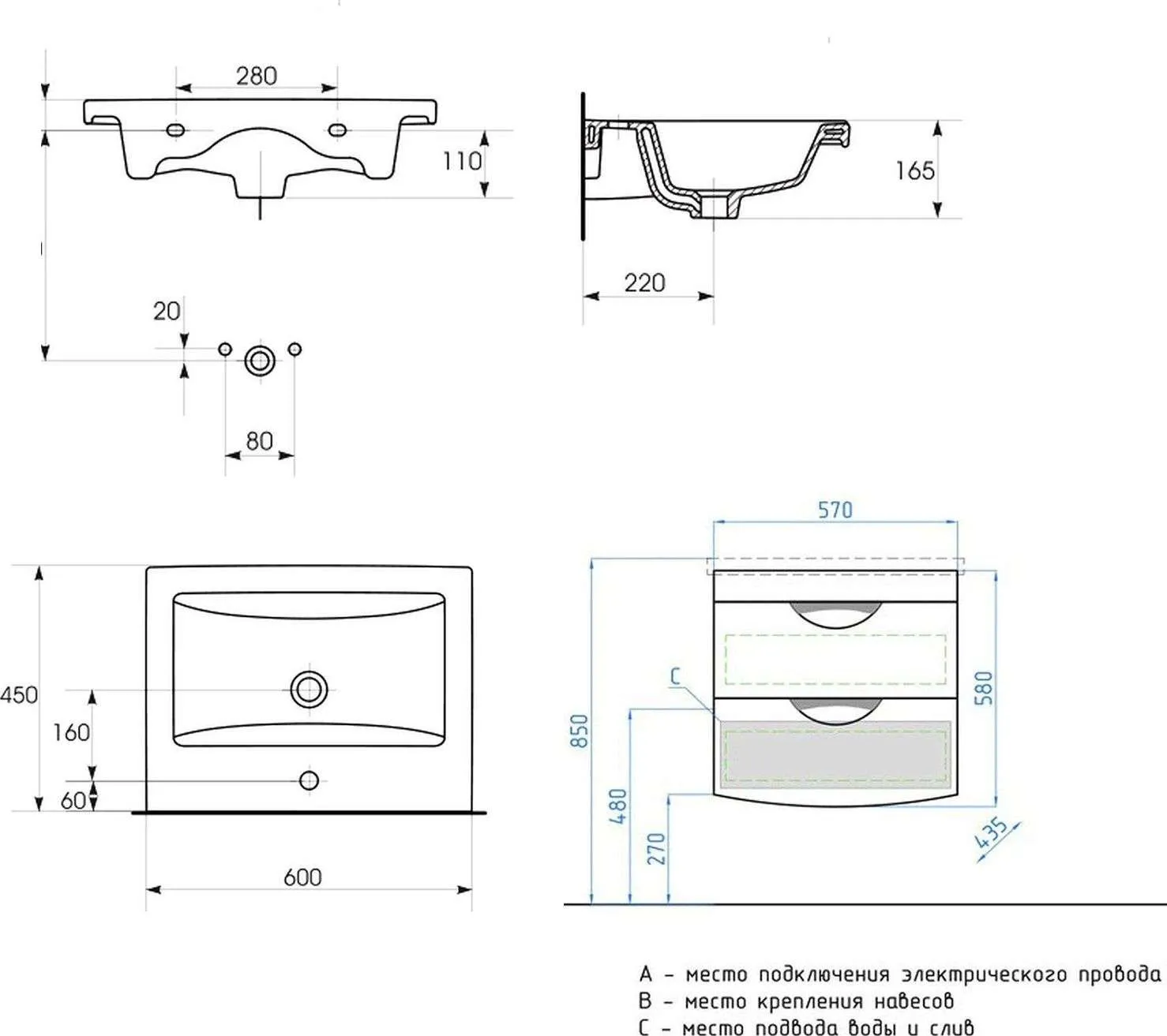 Тумба с раковиной Style Line Жасмин-2 55 подвесная