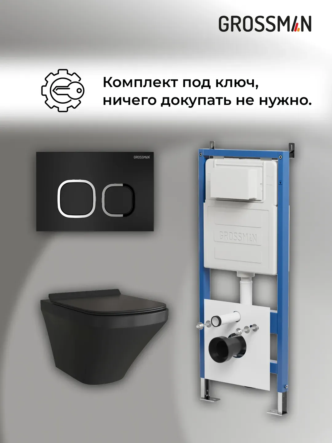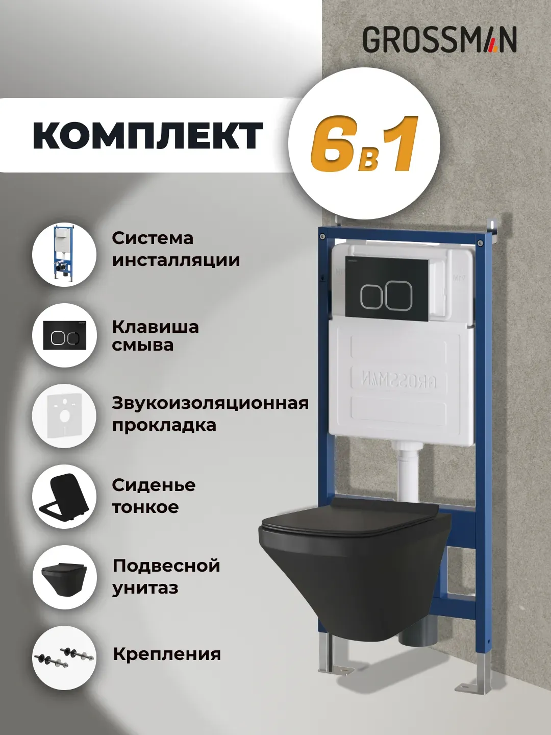 Унитаз Grossman 97.4440BMS.02.210 с инсталляцией и черной матовой кнопкой смыва