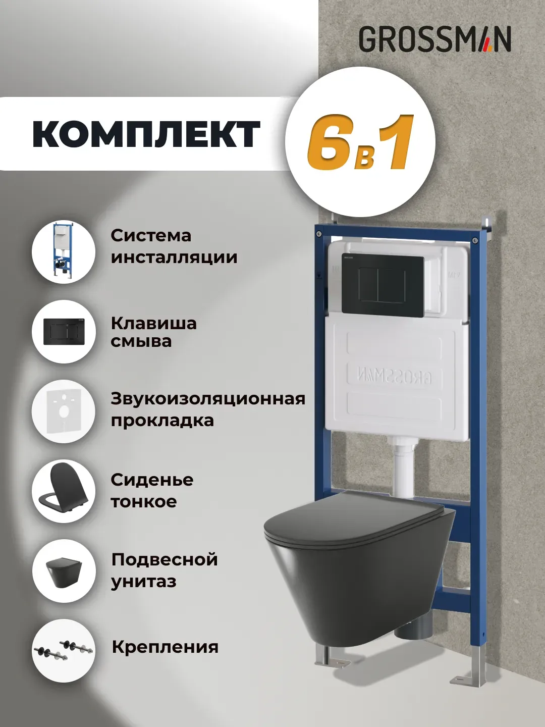 Унитаз Grossman 97.4477BMS.04.21M с инсталляцией и чёрной матовой кнопкой смыва