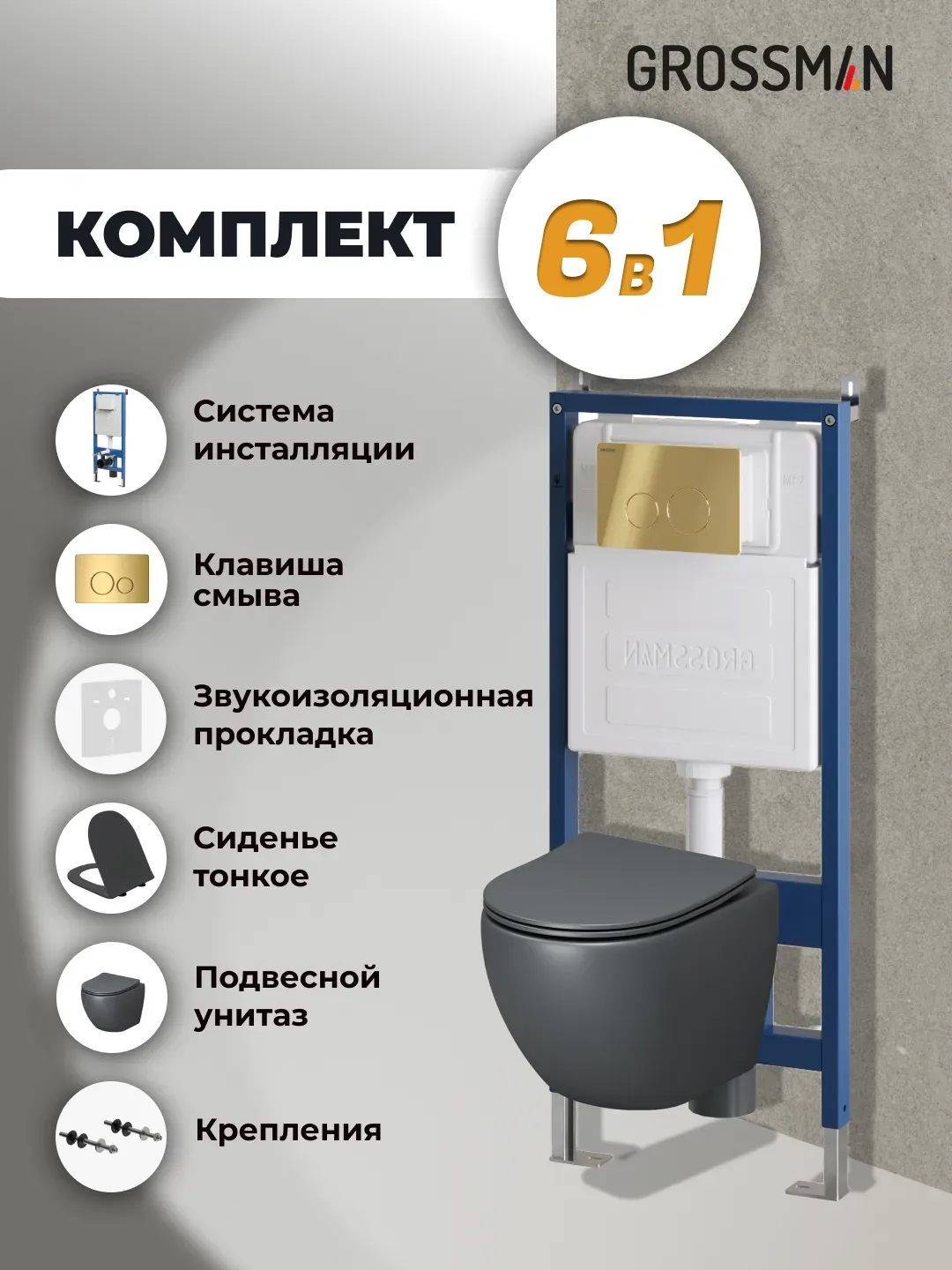 Унитаз Grossman Color 97.4455GMS.05.30M с инсталляцией и золото глянцевой кнопкой смыва
