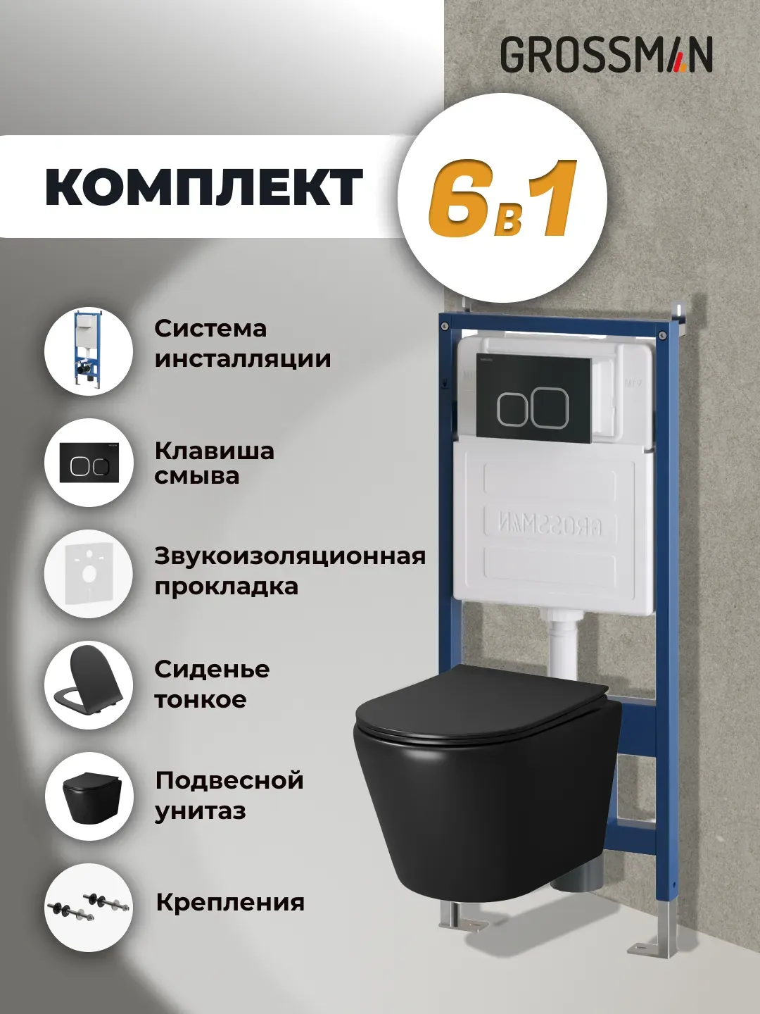 Унитаз Grossman Fly 97.4478BMS.02.210 с инсталляцией и черной матовой кнопкой смыва