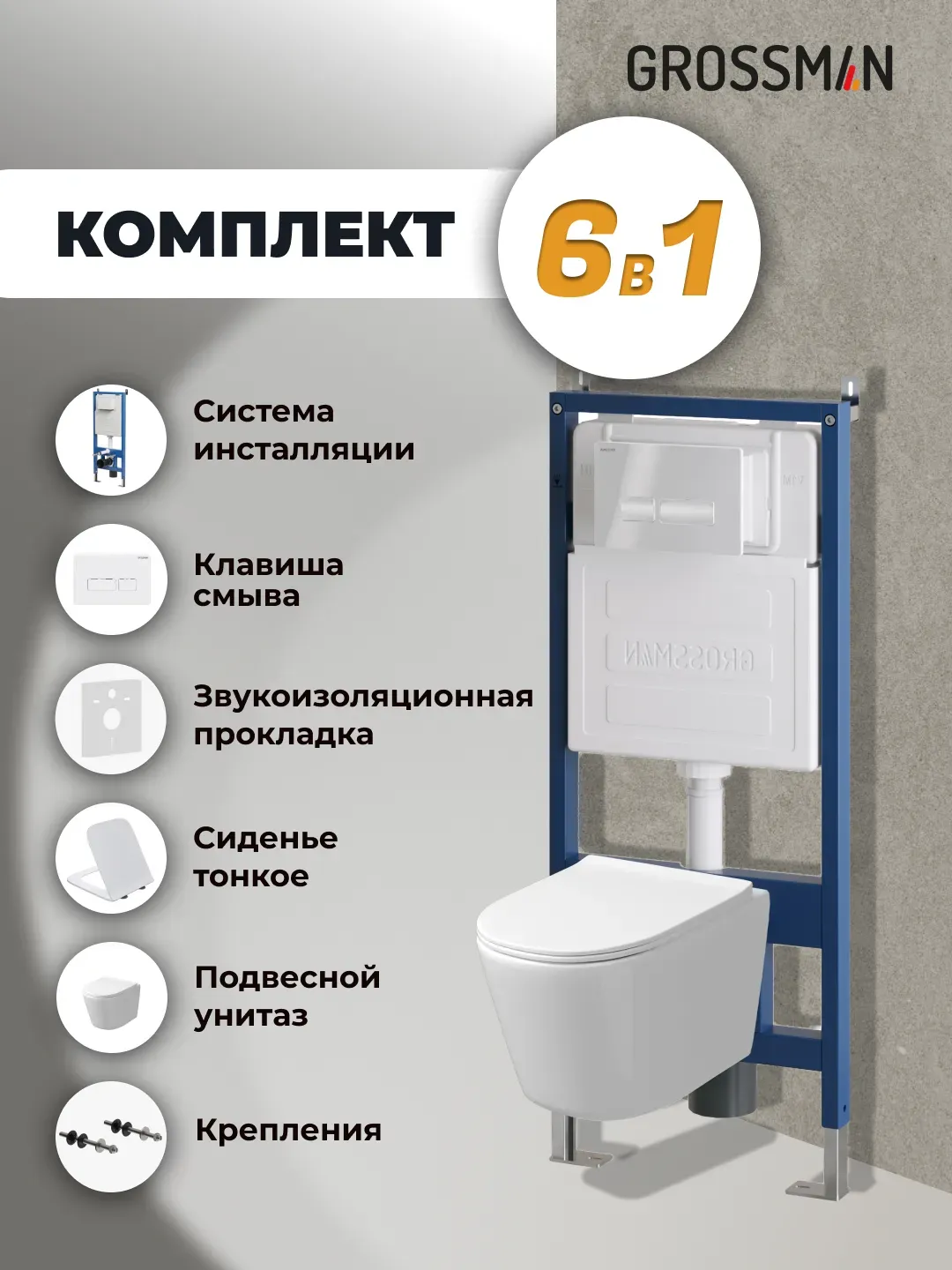 Унитаз Grossman Торнадо 97.4477SQ.03.000 с инсталляцией и белой глянцевой кнопкой смыва