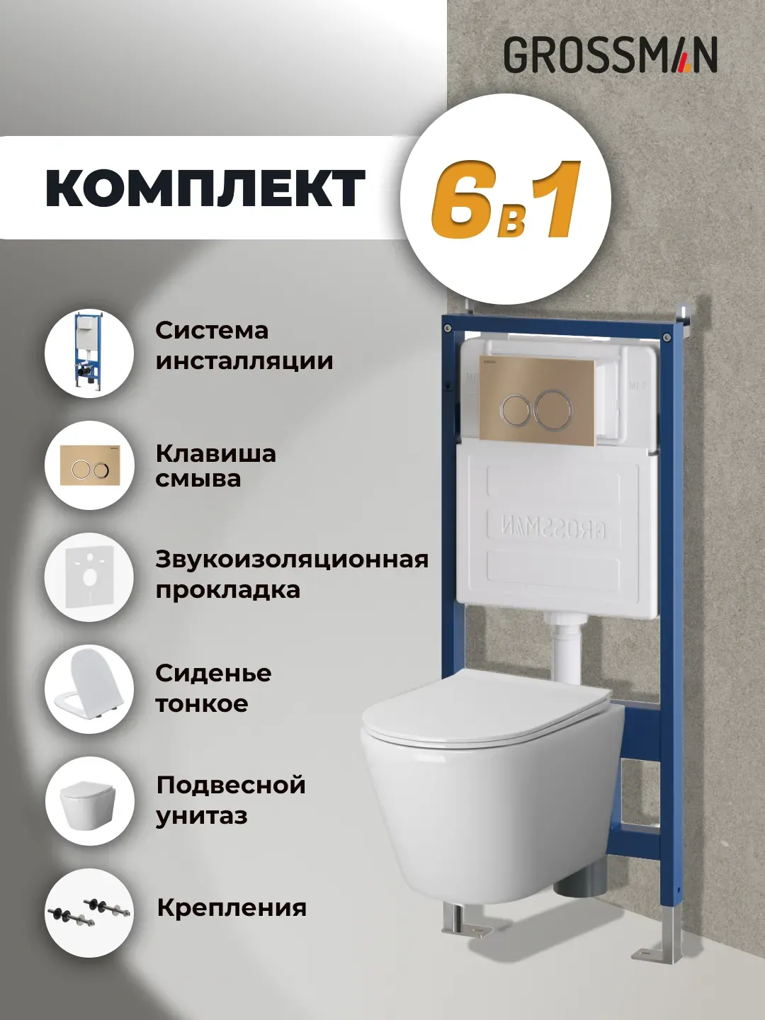 Унитаз Grossman Торнадо 97.4478SQ.01.310 с инсталляцией и золото матовой кнопкой смыва