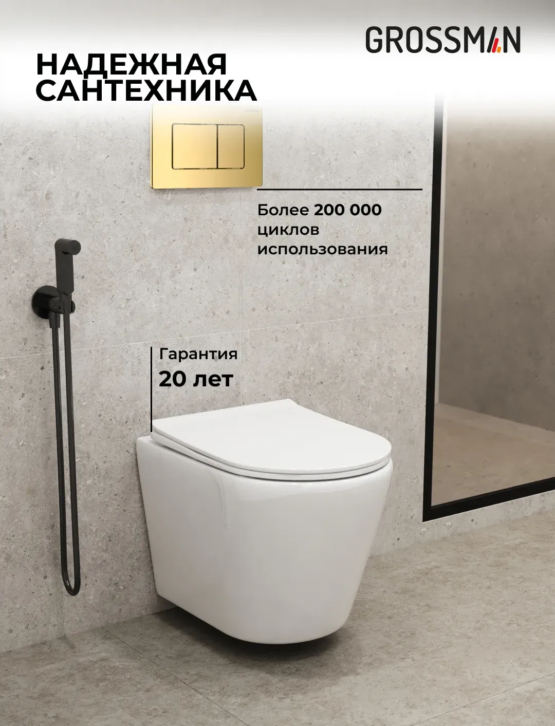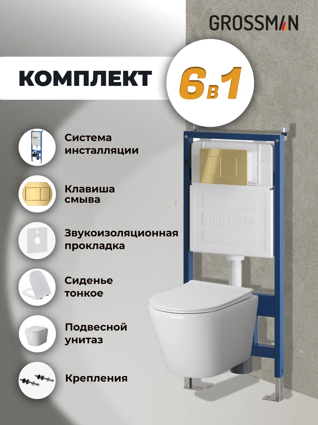 Унитаз Grossman Торнадо 97.4478SQ.04.30M с инсталляцией и золото глянцевой кнопкой смыва