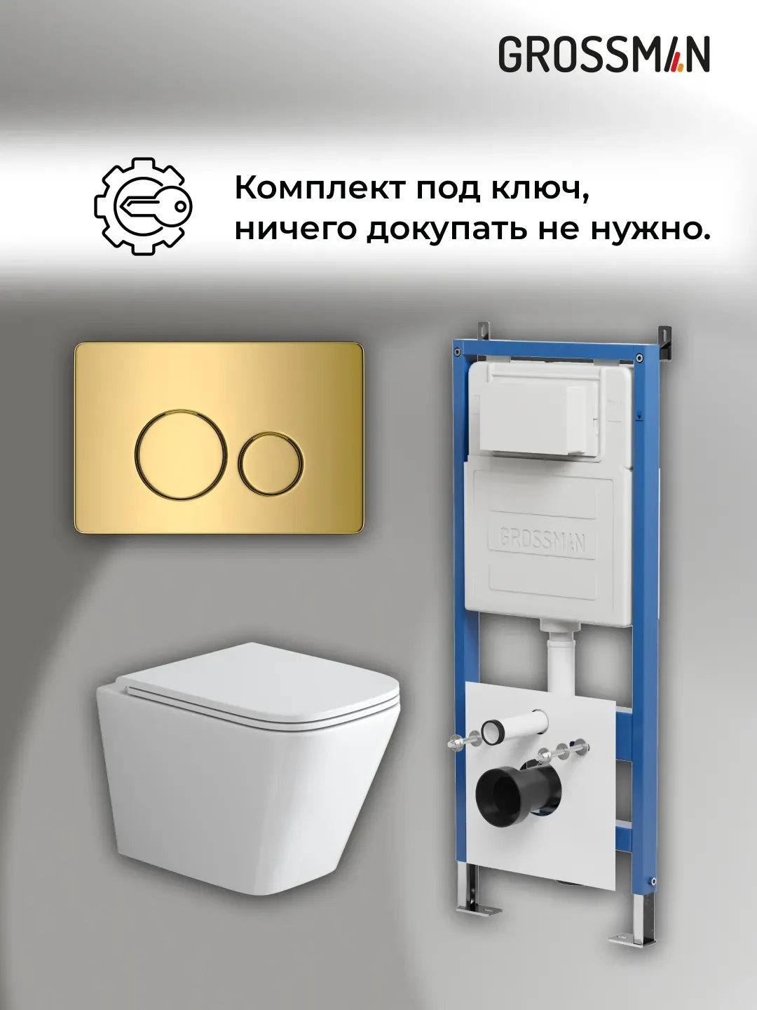 Унитаз Grossman Торнадо 97.4479SQ.05.30M с инсталляцией и золото глянцевой кнопкой смыва