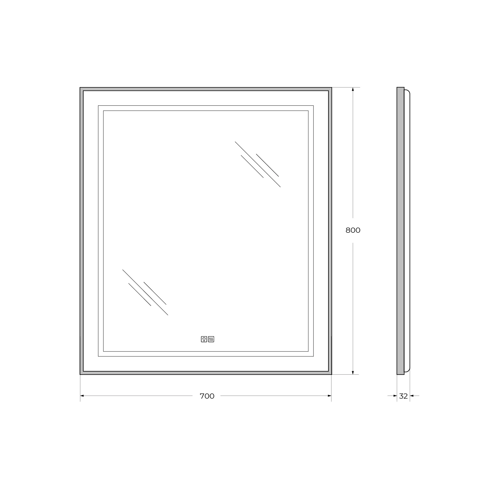 Зеркало в алюминиевой раме с встроенным светильником, сенсорным выключателем и подогревом.