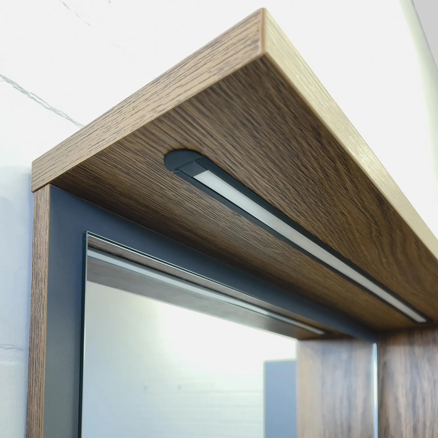 Торговая марка: Comforty Название: Зеркало-шкаф Артикул: 00-00014147CF Варианты цвета корпуса и фасада: Дуб темно-коричневый/Антрацит Материал корпуса: влагостойкое ЛДСП Материал фасада: МДФ Габариты (ШхВхГ): 750*800*160 мм Зеркальное высококачественное полотно с амальгамой на основе серебра. За дверцей одна горизонтальная полка. Удобная полочка для размещения принадлежностей для умывания. В верхней полочке установлен LED светильник. Выключатель подсветки бесконтактный со встроенной функцией регулировки яркости. Температура подсветки: 6000-6500К холодная. Фасад зеркального шкафа изготовлен из МДФ и облицован в пленку цвета антрацит.