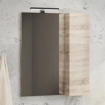 Створка оснащена петлями с плавным закрыванием. Высококачественное зеркальное полотно с амальгамой на основе серебра. Мебельный элемент из влагостойкого ДСП цвет дуб сонома. За дверцей две дополнительные полки. Зеркало-шкаф универсальное, может быть подвешено в правом и левом исполнении. Название: Зеркало-шкаф Артикул: 00004142221CF Цвет: Дуб сонома Габариты (ШхВхГ): 600*800*150 мм Инструкция для мебели для ванных комнат COMFORTY