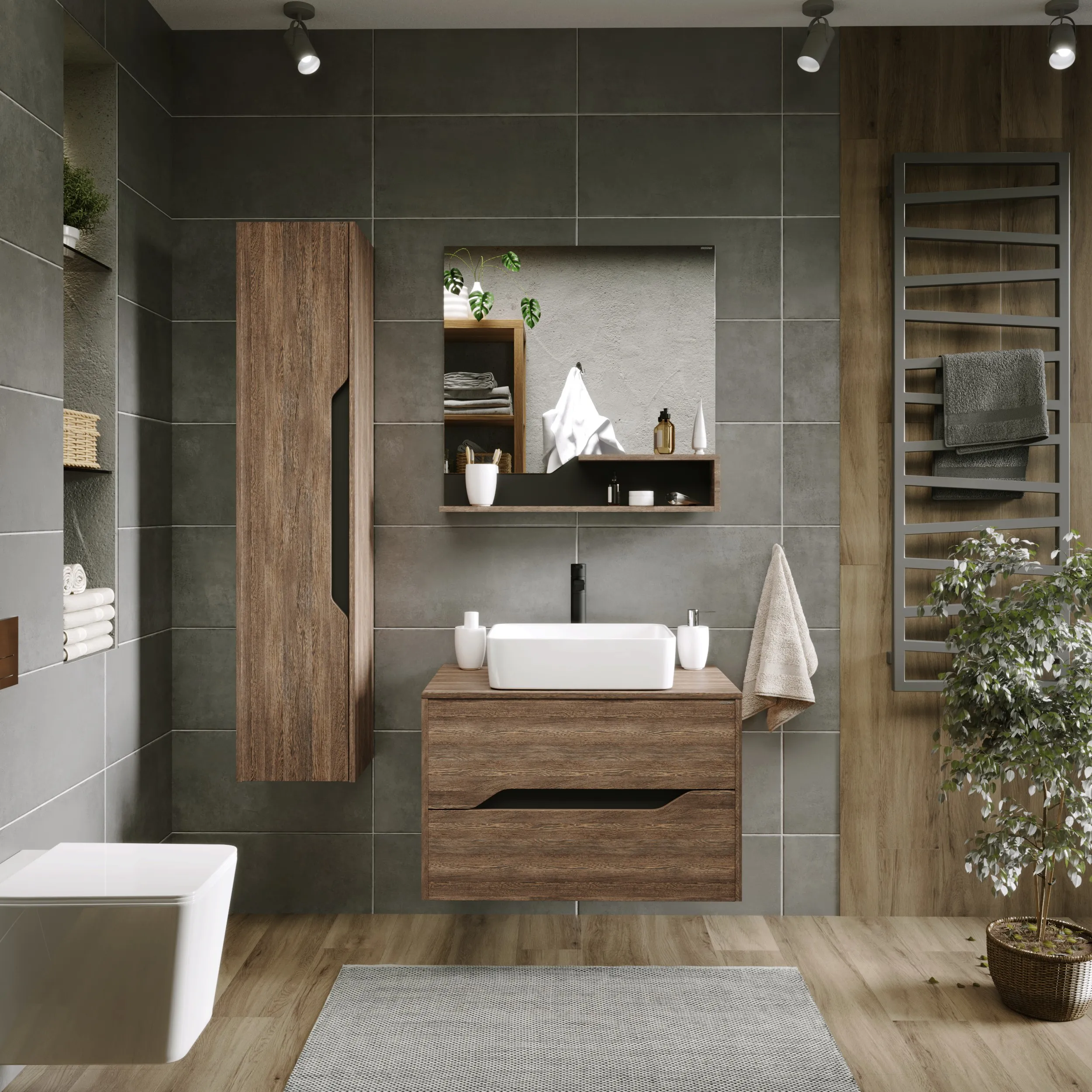 Зеркало Лайф 80 см выглядит оригинально и эксклюзивно. Ассиметричные линии и детали придают динамики ванной комнате. Двухярусная открытая полка дает быстрый доступ к косметике и предметам гигиены. Пленка в цвете графит на задней стенке защищает зеркальную поверхность от загрязнений и брызг. Зеркало изготовлено из влагостойких материалов, устойчивое к механическим воздействиям, перепадам температуры и высокой влажности. Корпус ЛДСП графит, полка МДФ в пленке винтажное дерево темное. Подвесы для крепления зеркала - в комплекте.