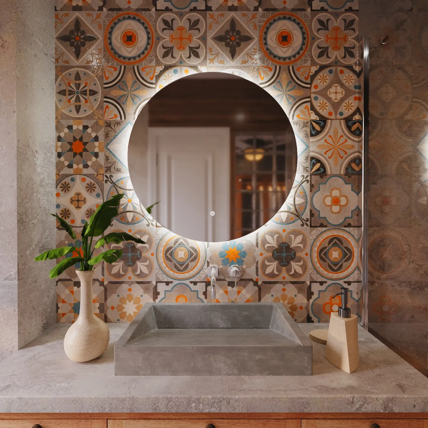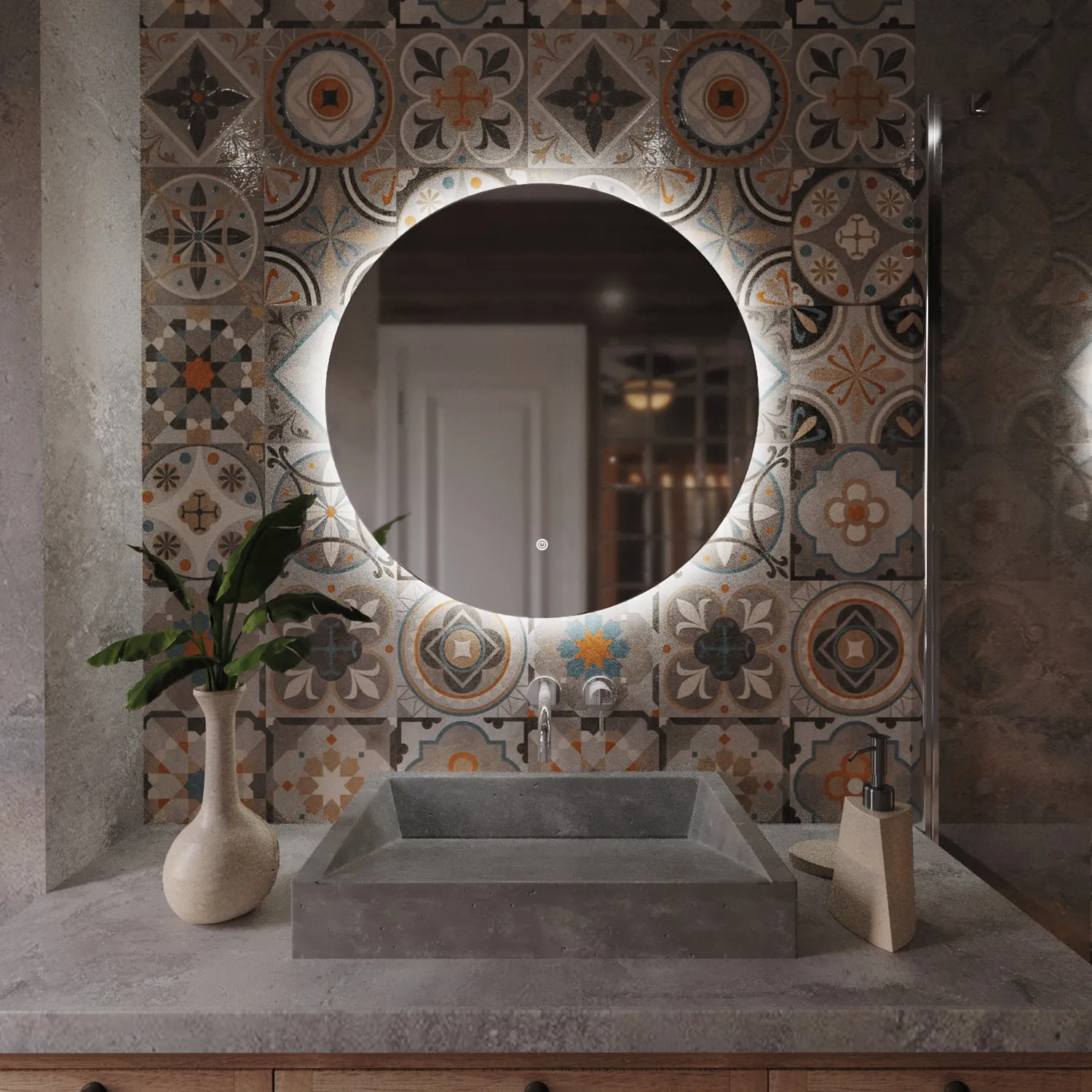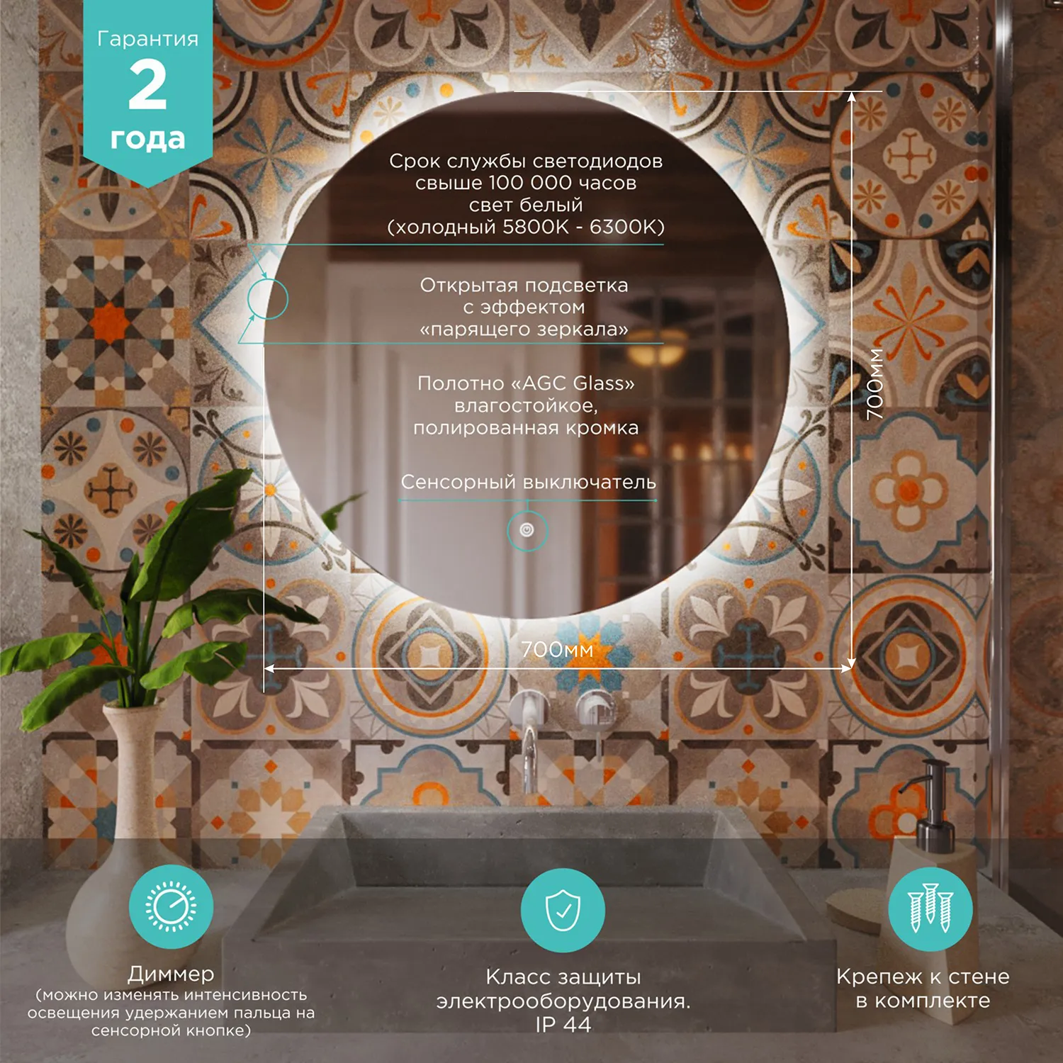 Настенное зеркало для ванной Mixline с подсветкой D70 см изготовлено из зеркального полотна толщиной 4 мм. Оснащено сенсорным выключателем и диммером, который при удержании пальца на сенсоре позволяет менять интенсивность освещения. Свет белый (холодный 5800К - 6300К). Все электрические компоненты размещены внутри корпуса из Abs-пластика, который защищает от влаги и механических повреждений. В качестве элемента подсветки используется светодиодная лента, которая обеспечивает яркое свечение по периметру зеркала. Срок службы диодов - 100 000 часов. Зеркало влагостойкое и защищено от попадания случайных брызг и капель воды. Комплектация: паспорт и крепеж.