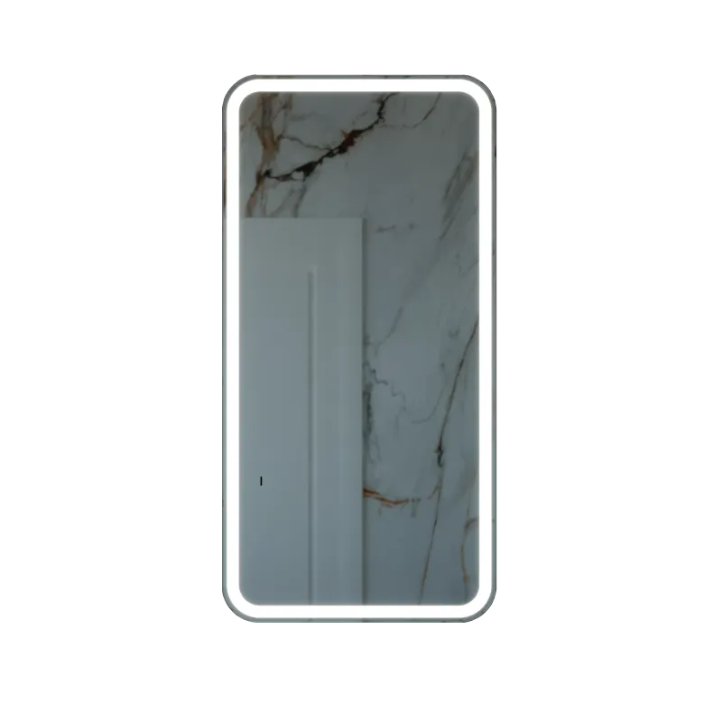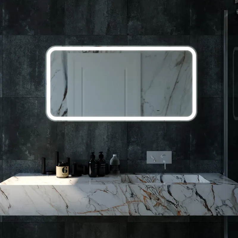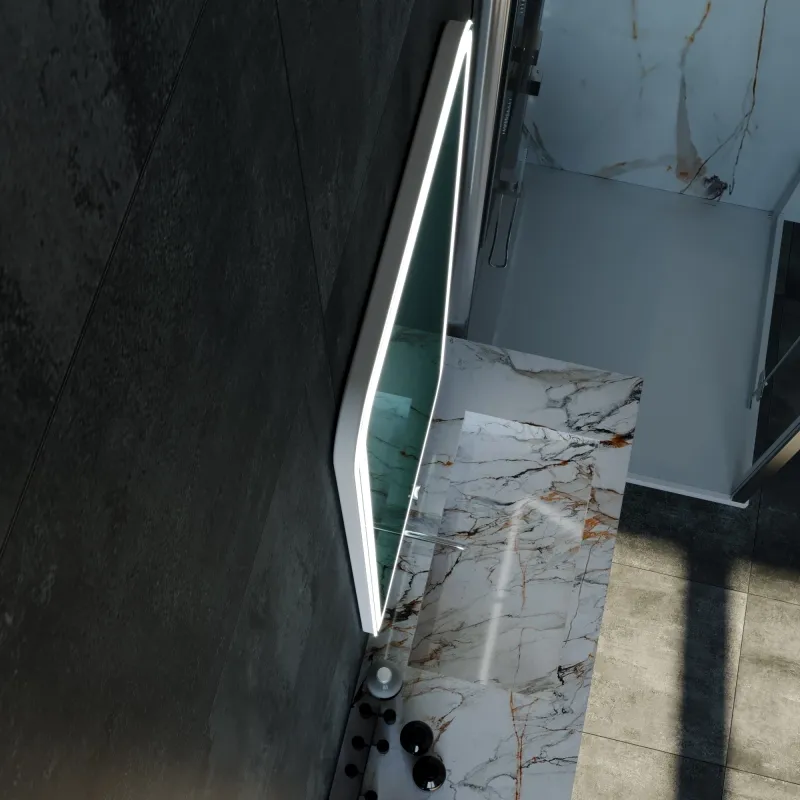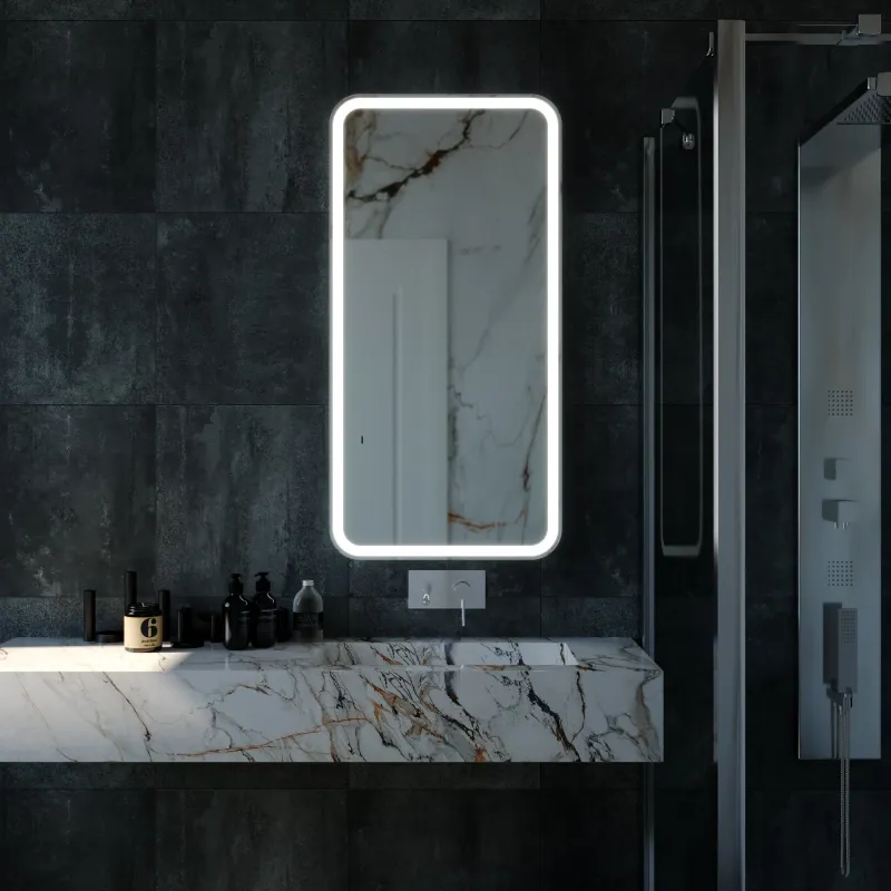 Зеркало локаничного дизайна с фронтальной LED-подсветкой и возможность монтажа как вертикально, так и горизонтально, оснощённое бесконтактным сенсором. Световая рама расположена не по краям периметра, а несколько отступает от него. Графичность рисунка и всей формы смягчают скруглённые углы. Благодаря этой находке довольно минималистичный дизайн не мешает этому зеркалу быть яркой акцентной деталью любого пространства: от строгой, упорядоченной классики и сдержанного минимализма до свободолюбивых эклектичных интерьеров.