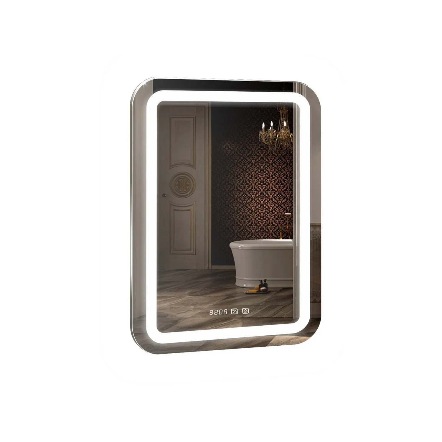 Настенное зеркало для ванной Mixline с подсветкой 55 х 80 см изготовлено из зеркального полотна толщиной 4 мм. Оснащено сенсорным выключателем и диммером, который при удержании пальца на сенсоре позволяет менять интенсивность освещения. Свет белый 6000К. Все электрические компоненты размещены внутри корпуса из Abs-пластика, который защищает от влаги и механических повреждений. В качестве элемента подсветки используется светодиодная лента, которая обеспечивает яркое свечение по периметру зеркала. Срок службы диодов - 100 000 часов. Зеркало влагостойкое и защищено от попадания случайных брызг и капель воды. Подогрев полотна исключит запотевание зеркальной поверхности. Поле для отображения часов нанесено методом лазерной гравировки. Время регулируется с помощью сенсорной кнопки. Комплектация: крепеж, инструкция.