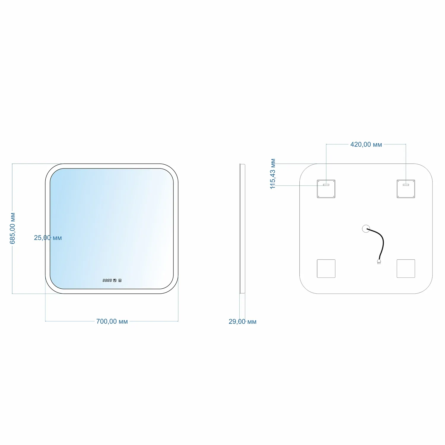 Настенное зеркало для ванной Mixline с подсветкой 70 х 68 см изготовлено из зеркального полотна толщиной 4 мм. Оснащено сенсорным выключателем и диммером, который при удержании пальца на сенсоре позволяет менять интенсивность освещения. Свет белый 6000К. Все электрические компоненты размещены внутри корпуса из Abs-пластика, который защищает от влаги и механических повреждений. В качестве элемента подсветки используется светодиодная лента, которая обеспечивает яркое свечение по периметру зеркала. Срок службы диодов - 100 000 часов. Зеркало влагостойкое и защищено от попадания случайных брызг и капель воды. Подогрев полотна исключит запотевание зеркальной поверхности. Поле для отображения часов нанесено методом лазерной гравировки. Время регулируется с помощью сенсорной кнопки. Комплектация: крепеж, инструкция.