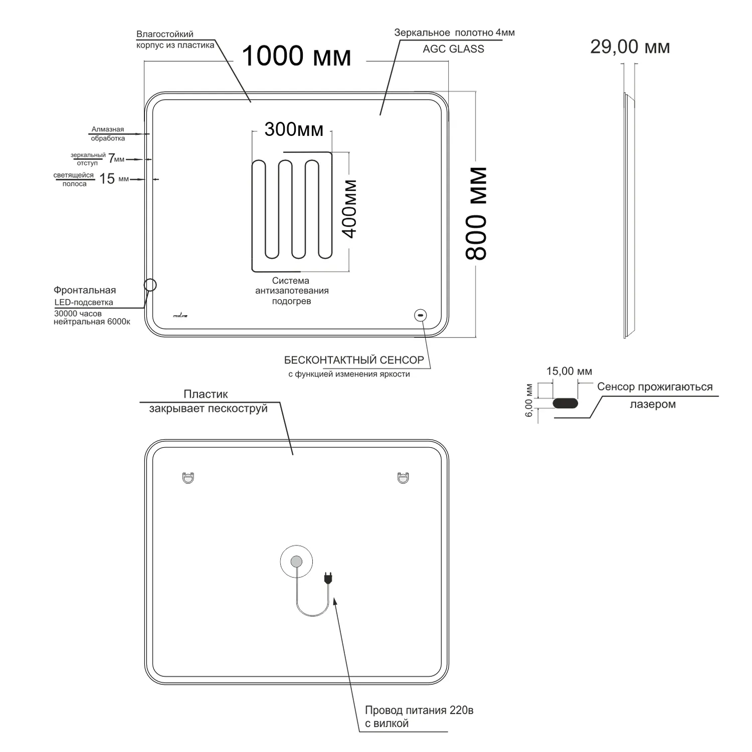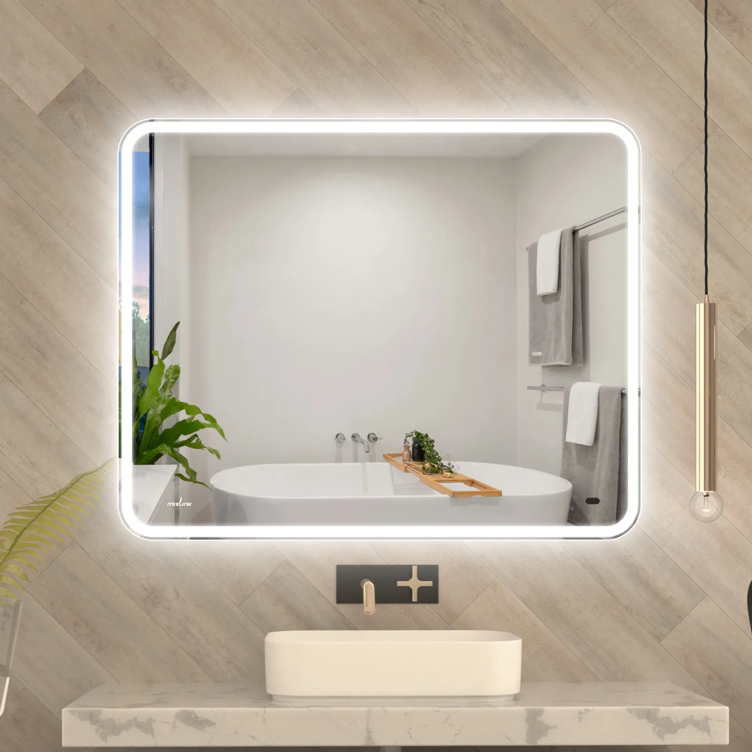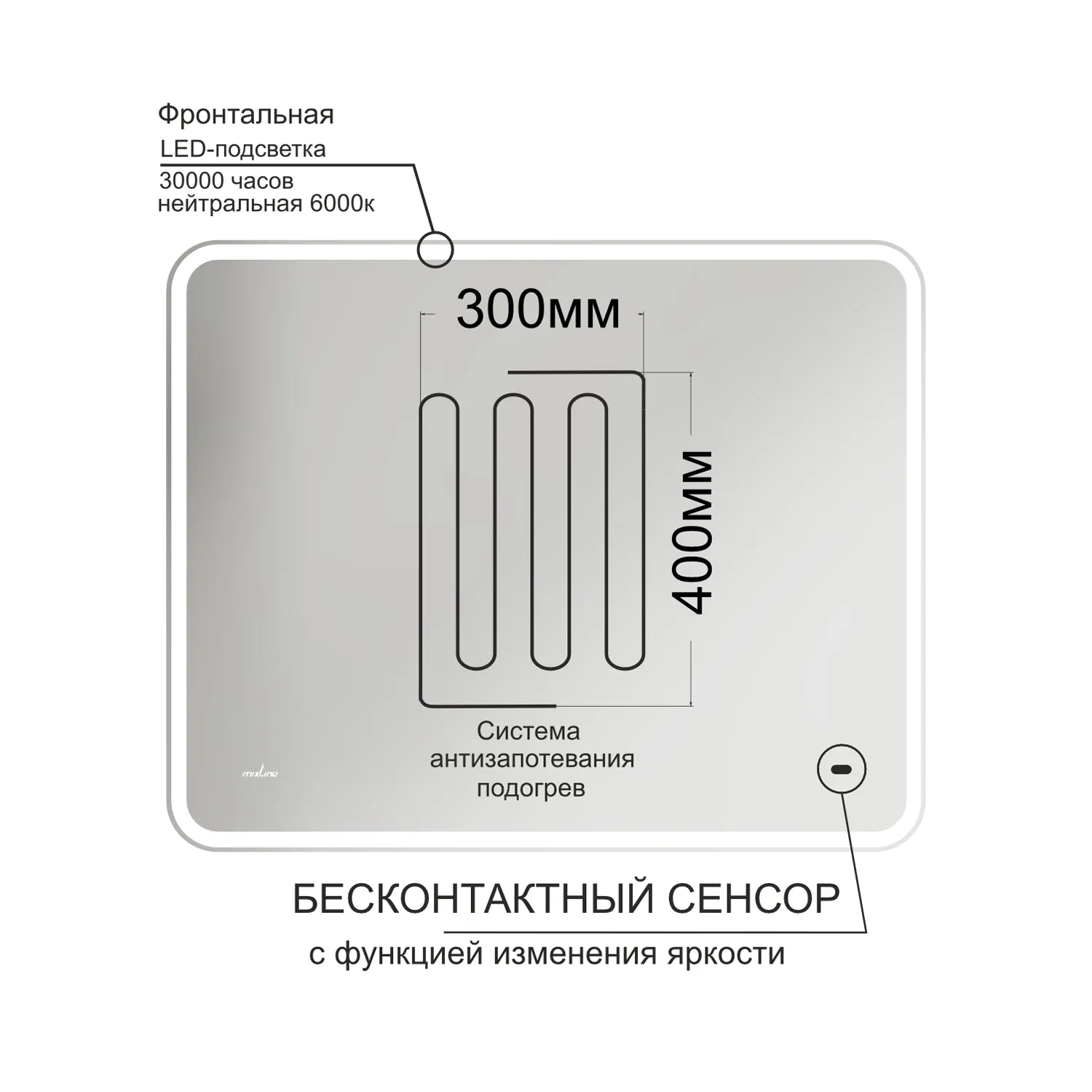 Настенное зеркало для ванной Mixline с подсветкой 100 х 80 см изготовлено из зеркального полотна толщиной 4 мм. Оснащено подогревом зеркального полотна, сенсорным выключателем и диммером, который при удержании пальца на сенсоре позволяет менять интенсивность освещения. Свет белый (холодный 5800К - 6300К). Все электрические компоненты размещены внутри корпуса из Abs-пластика, который защищает от влаги и механических повреждений. В качестве элемента подсветки используется светодиодная лента, которая обеспечивает яркое свечение по периметру зеркала. Срок службы диодов - 100 000 часов. Зеркало влагостойкое и защищено от попадания случайных брызг и капель воды. Комплектация: паспорт и крепеж.