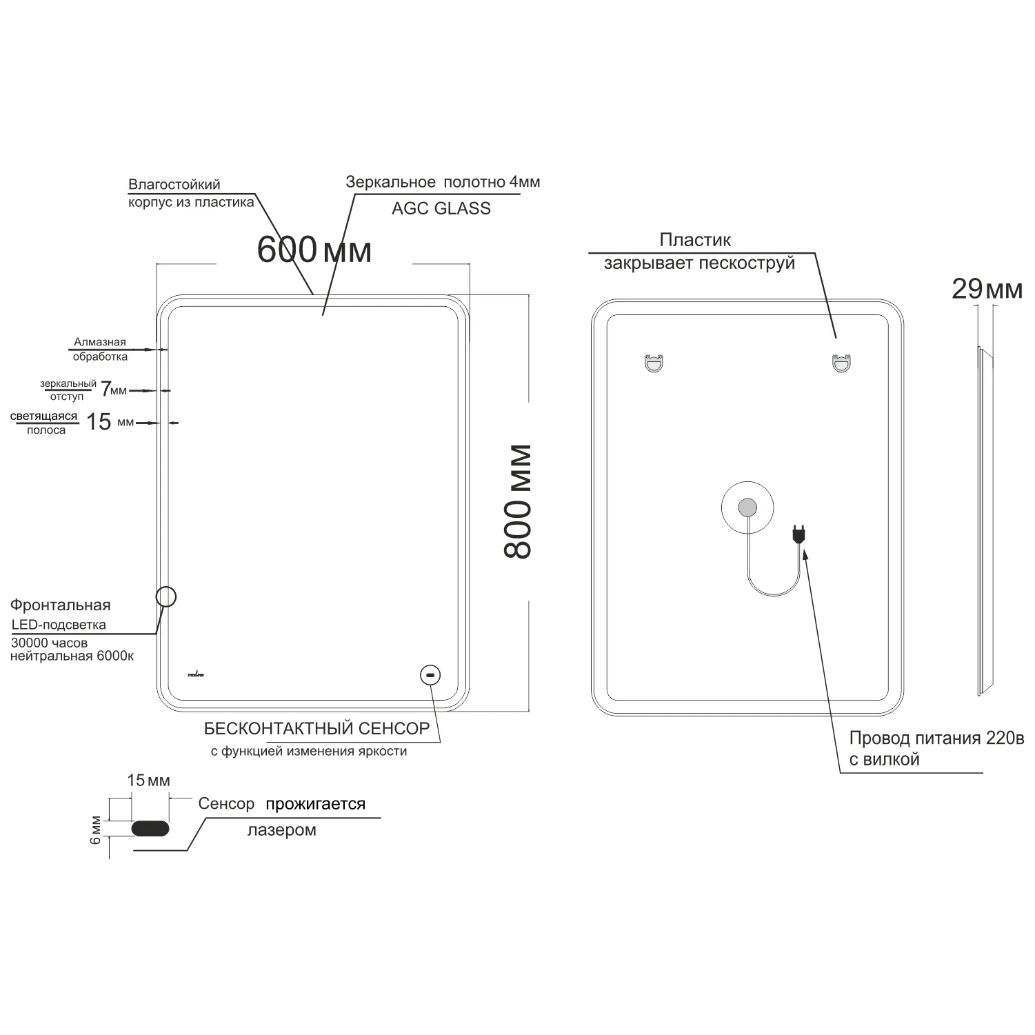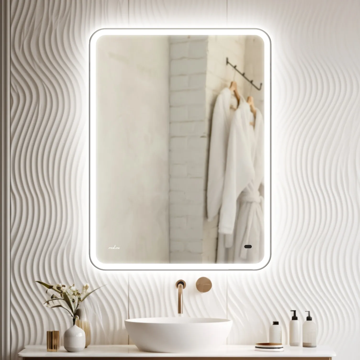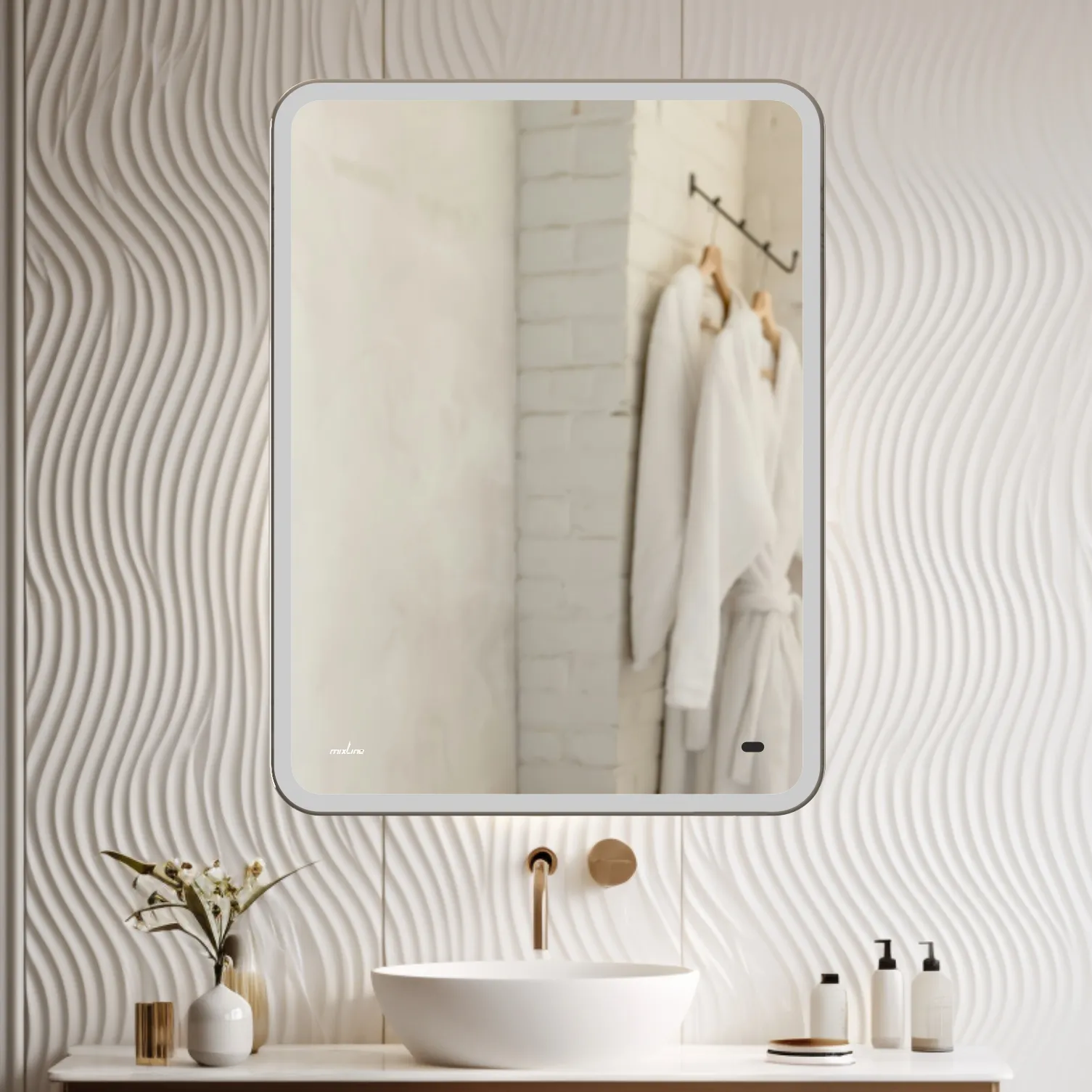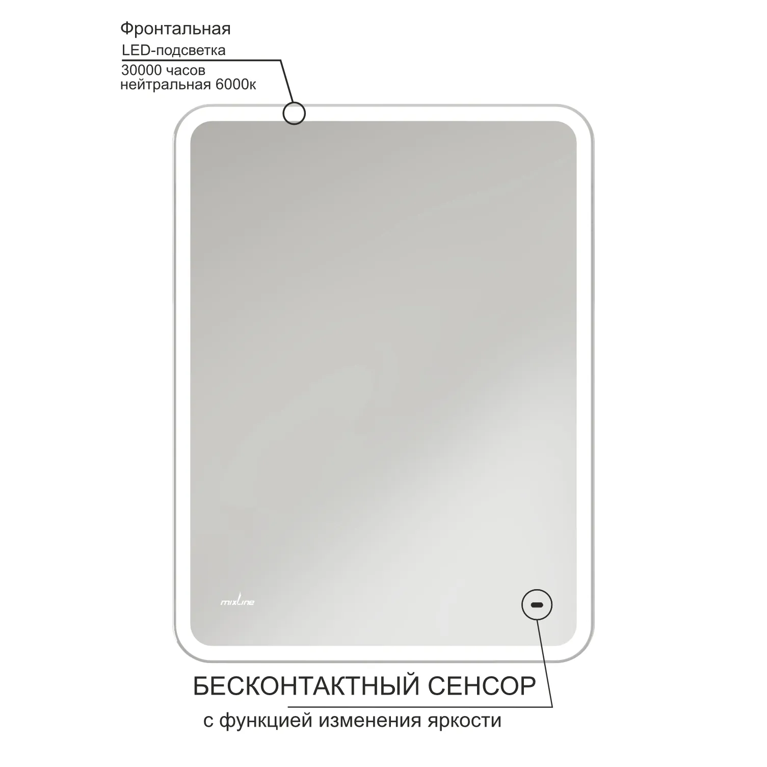 Настенное зеркало для ванной Mixline с подсветкой 60 х 80 см изготовлено из зеркального полотна толщиной 4 мм. Оснащено сенсорным выключателем и диммером, который при удержании пальца на сенсоре позволяет менять интенсивность освещения. Свет белый (холодный 5800К - 6300К). Все электрические компоненты размещены внутри корпуса из Abs-пластика, который защищает от влаги и механических повреждений. В качестве элемента подсветки используется светодиодная лента, которая обеспечивает яркое свечение по периметру зеркала. Срок службы диодов - 100 000 часов. Зеркало влагостойкое и защищено от попадания случайных брызг и капель воды. Комплектация: паспорт и крепеж.
