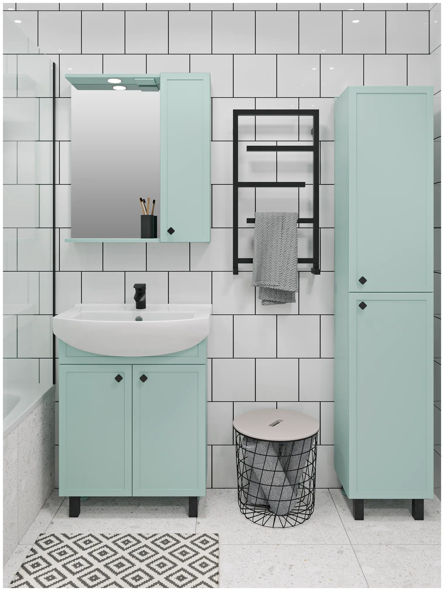 Шкафчик в ванной также оснащен врезным светодиодным светильником 220В и розеткой с выключателем. Это позволяет удобно освещать ванную комнату и использовать электроприборы. Петли шкафчика оснащены встроенным доводчиком, что обеспечивает плавное и бесшумное закрывание дверцы. Ручка на шкафчике добавляет эстетический акцент и облегчает открывание.