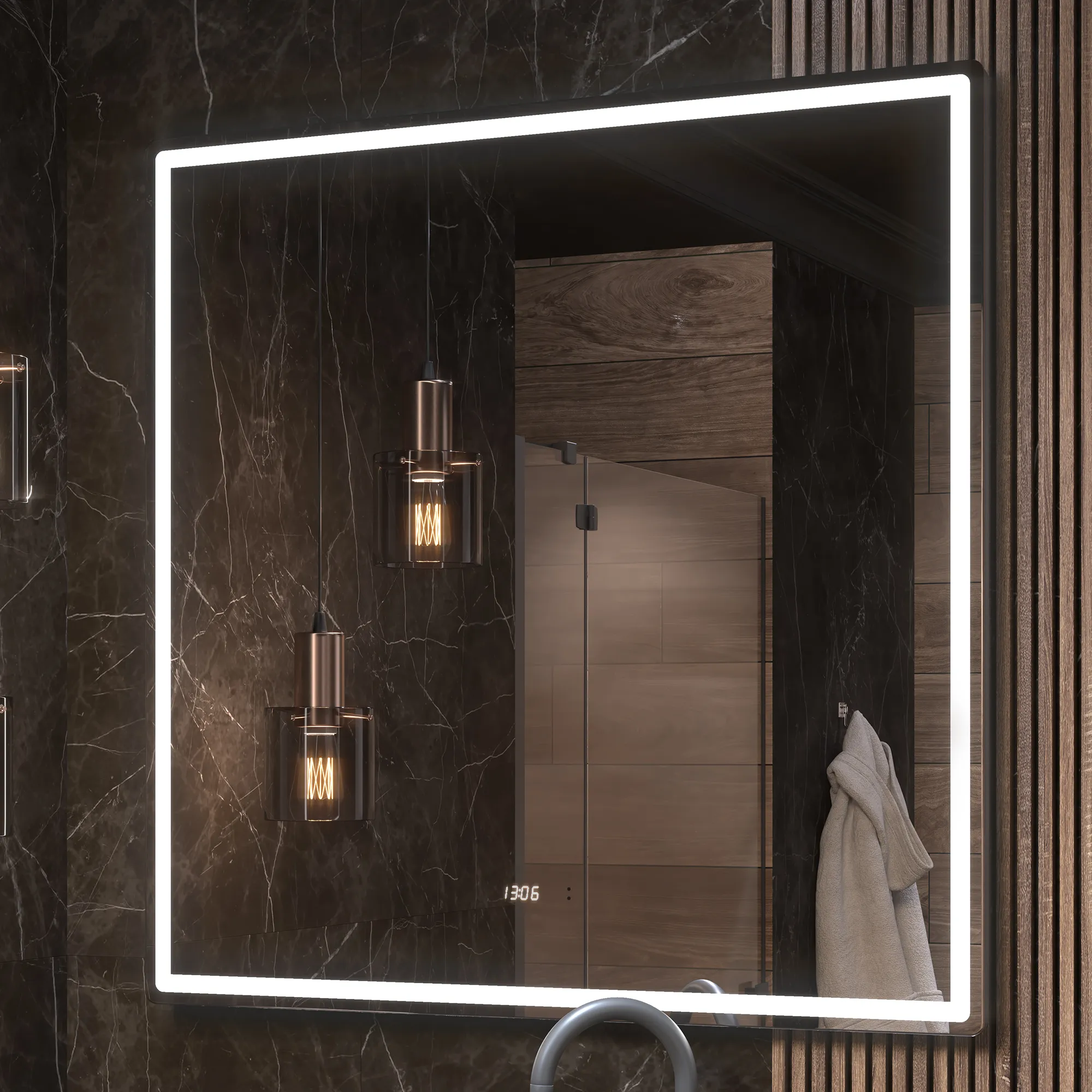 Бесконтактное управление (на взмах), светодиодная подсветка, встроенные часы, датчик температуры, функция антизапотевания, диммер