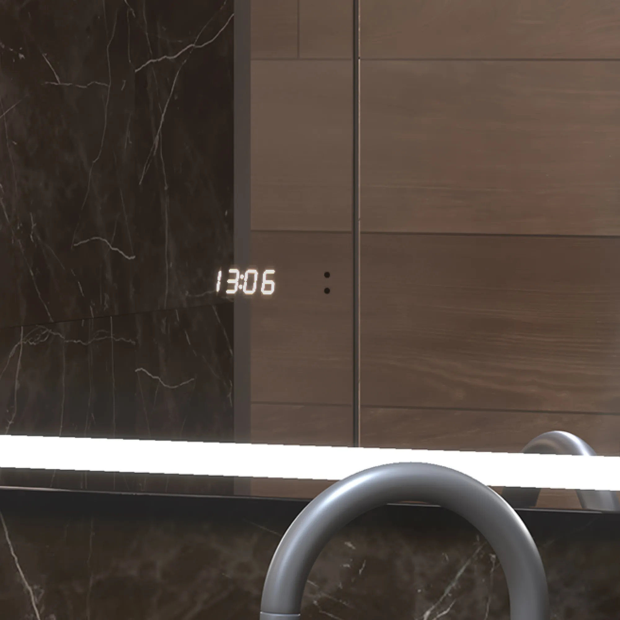 Бесконтактное управление (на взмах), светодиодная подсветка, встроенные часы, датчик температуры, функция антизапотевания, диммер
