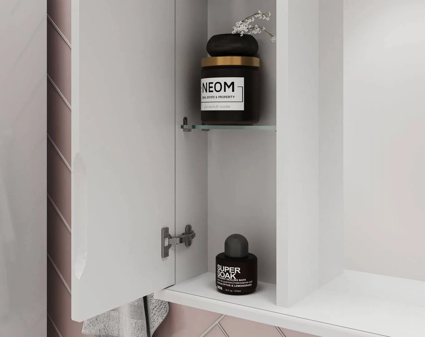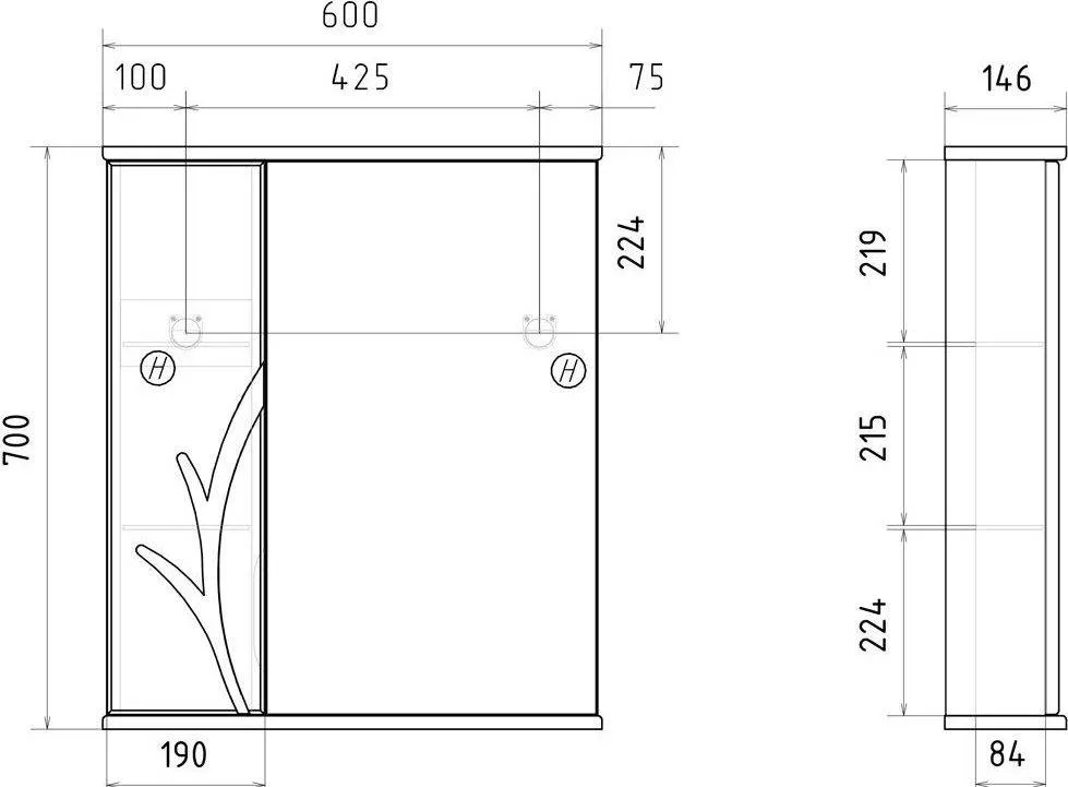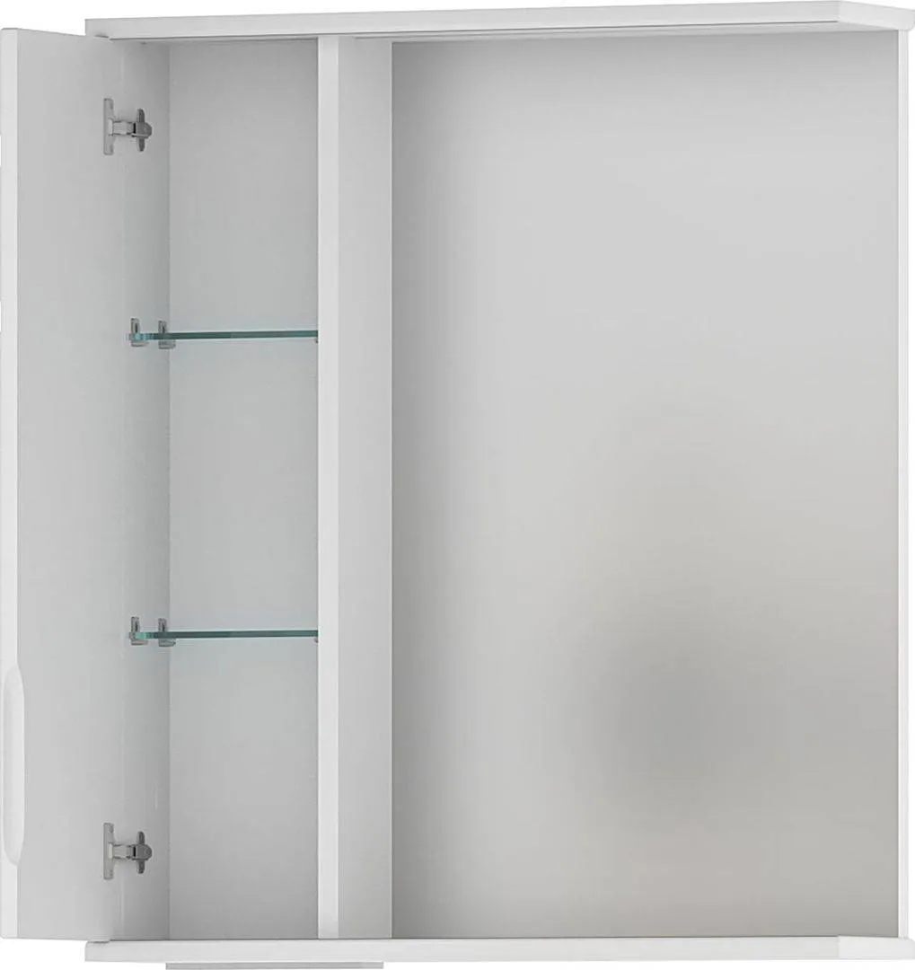 Зеркалос двумя стеклянными полками за распашной дверцей. Петли оснащены доводчиками. Фасад зеркального шкафа изготовлена из МДФ и облицована глянцевой пленкой ПВХ. Шкафчик открывается при помощи интегрированной ручки. Декоративна фрезеровка на фасаде, интегрированная ручка, фурнитура с доводчиками.
