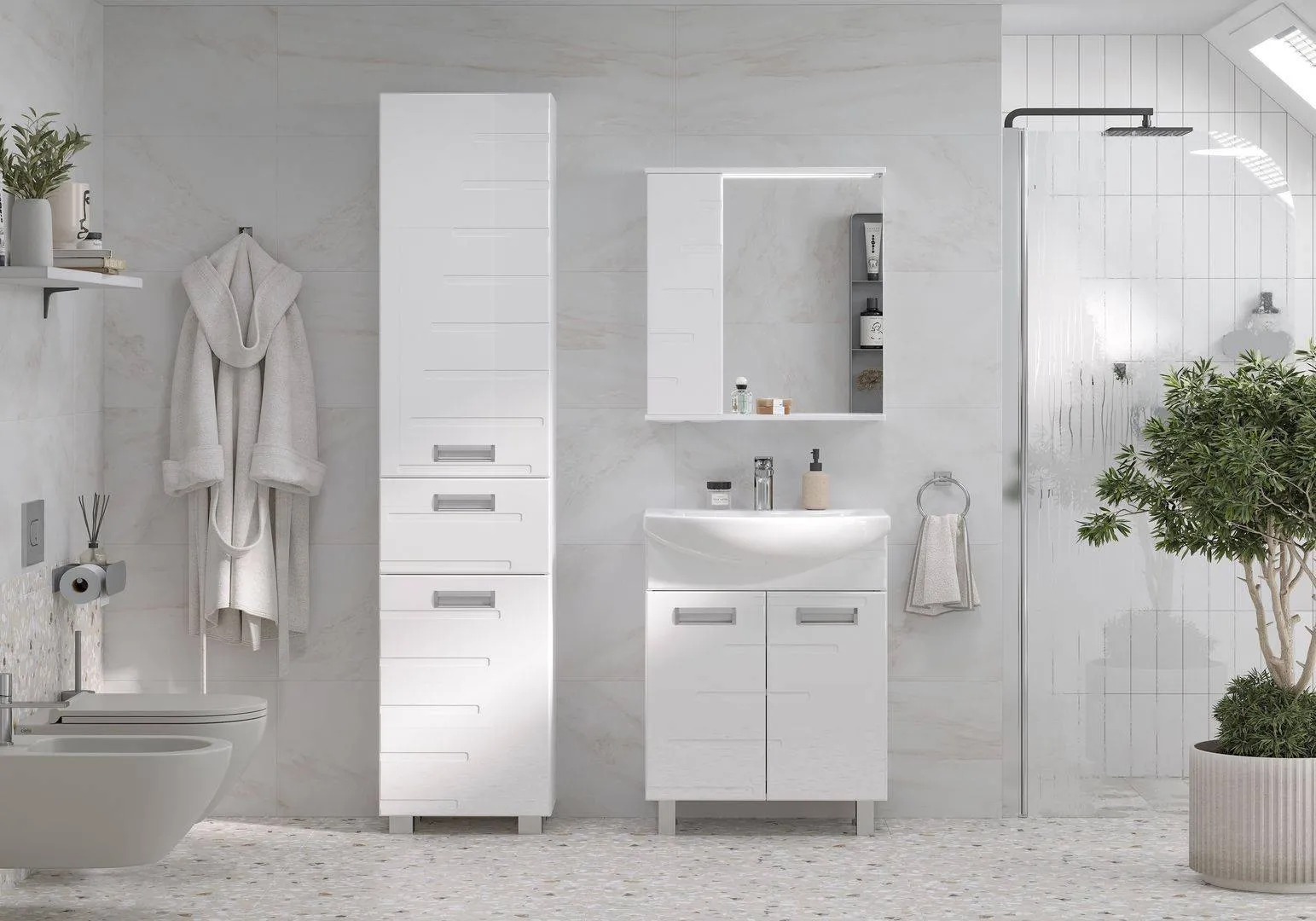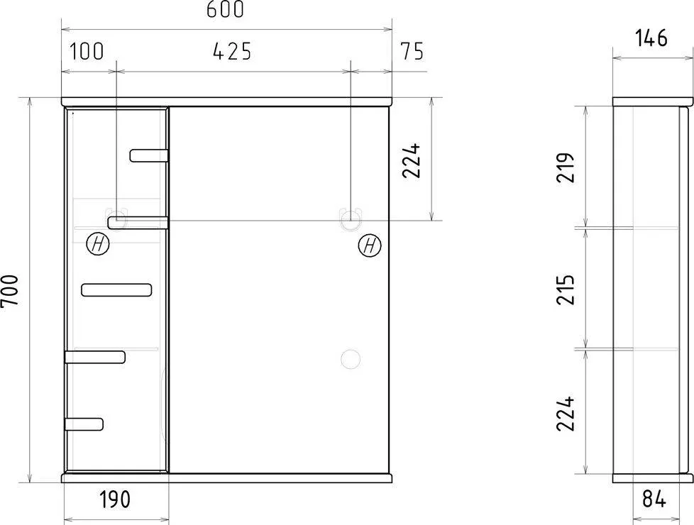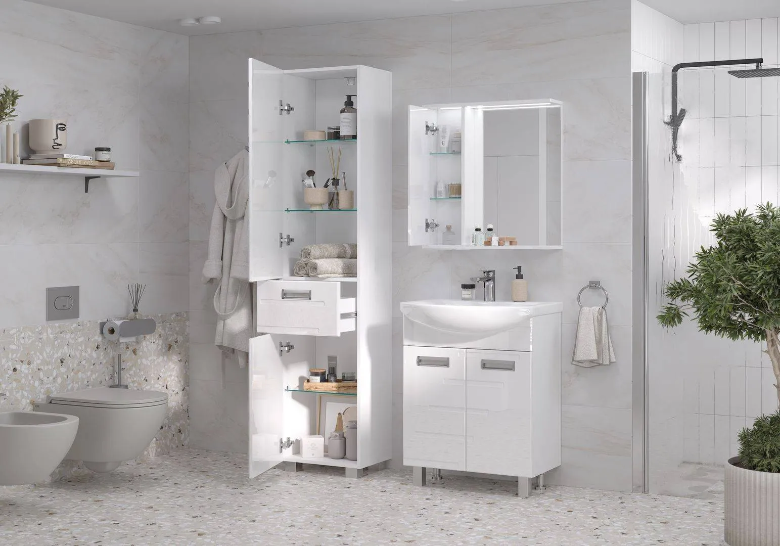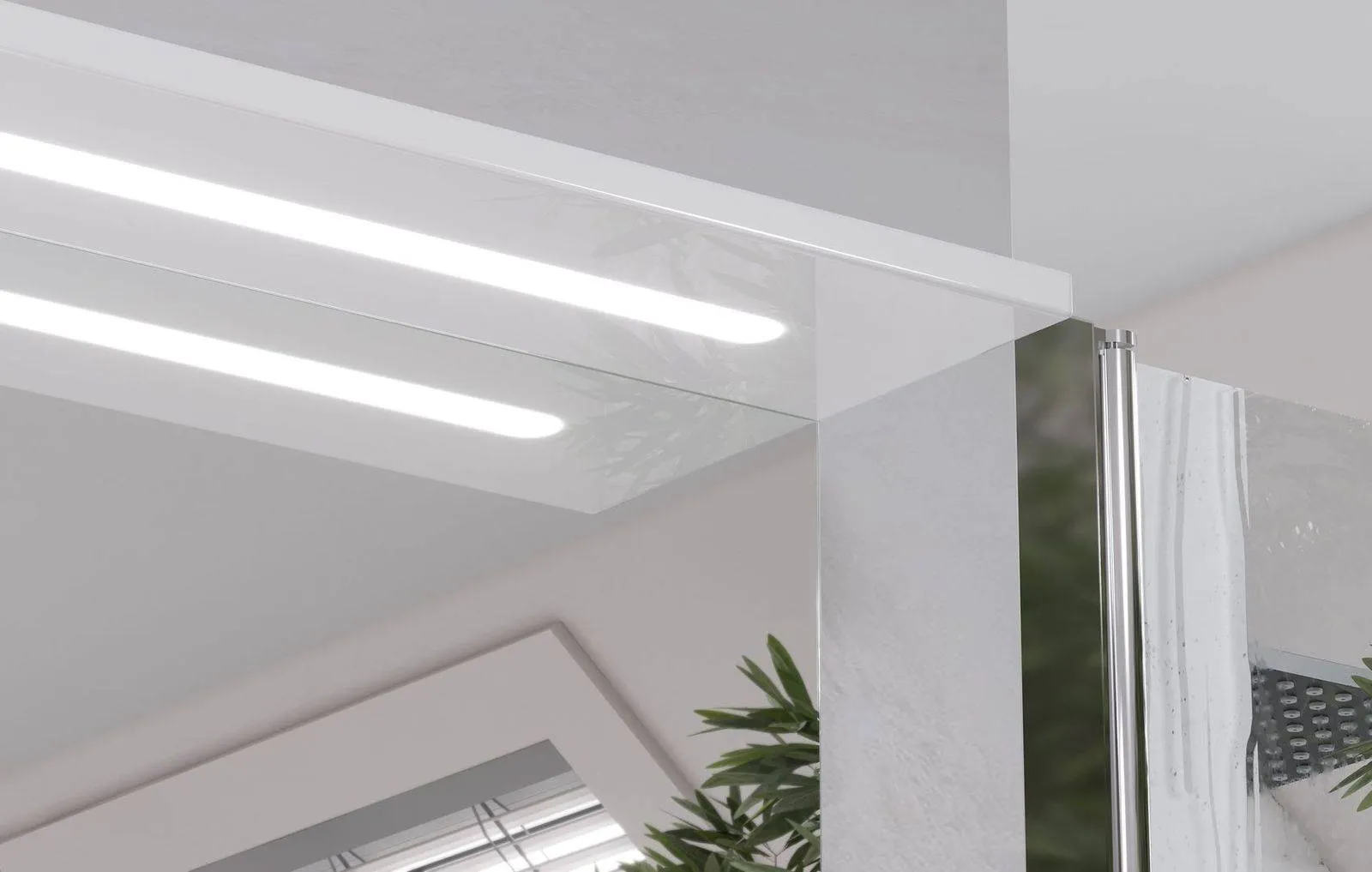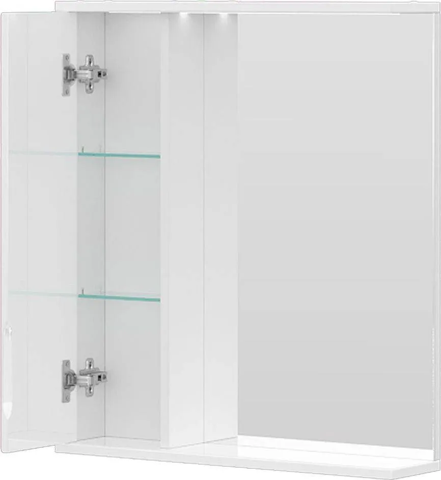 Зеркалос двумя стеклянными полками за распашной дверцей. Петли оснащены доводчиками. Фасад зеркального шкафа изготовлена из МДФ и облицована глянцевой пленкой ПВХ. Зеркалооснащено встроенной светодиодной подсветкой, электрической розеткой и выключателем. Шкафчик открывается при помощи интегрированной ручки. Декоративна фрезеровка на фасаде, интегрированная ручка, фурнитура с доводчиками, встроенная светодиодная подсветка, розетка, выключатель.