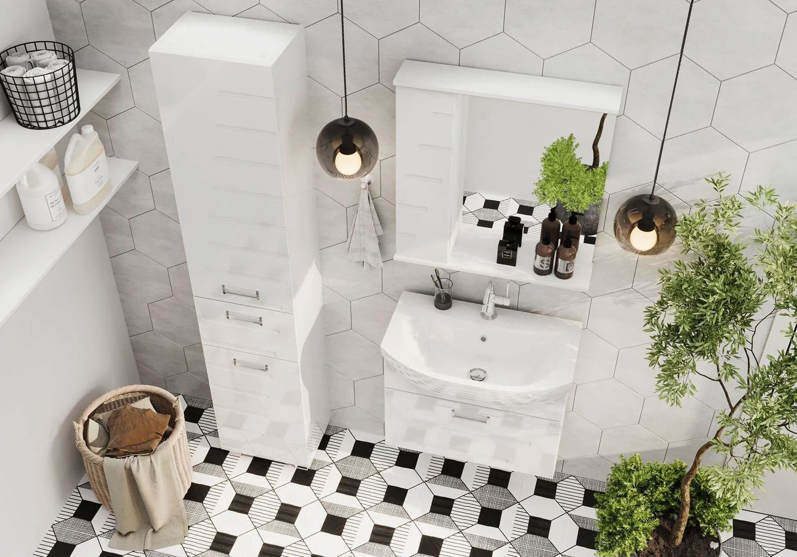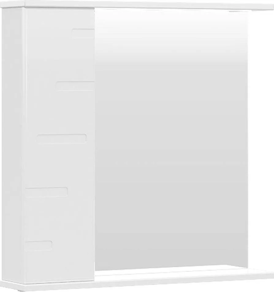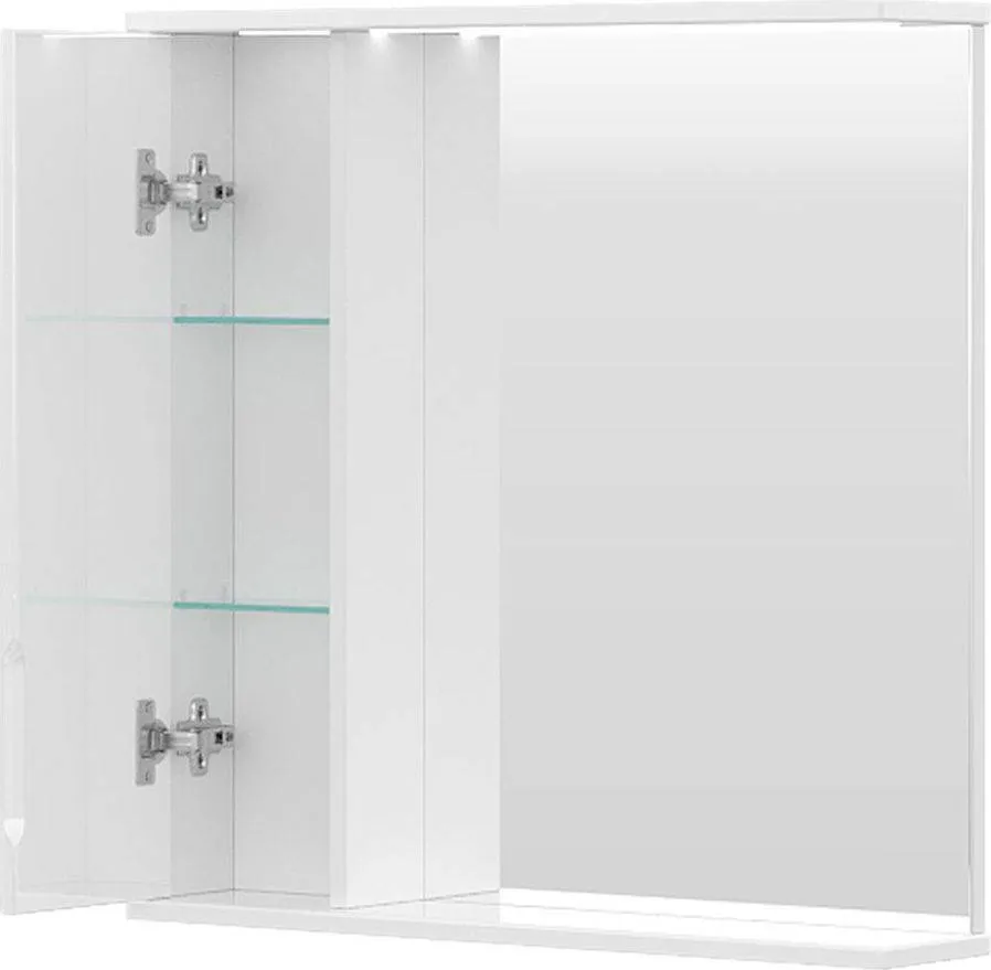 Зеркалос двумя стеклянными полками за распашной дверцей. Петли оснащены доводчиками. Фасад зеркального шкафа изготовлена из МДФ и облицована глянцевой пленкой ПВХ. Зеркалооснащено встроенной светодиодной подсветкой, электрической розеткой и выключателем. Шкафчик открывается при помощи интегрированной ручки. Интегрированная ручка, фурнитура с доводчиками, встроенная светодиодная подсветка, розетка, выключатель.