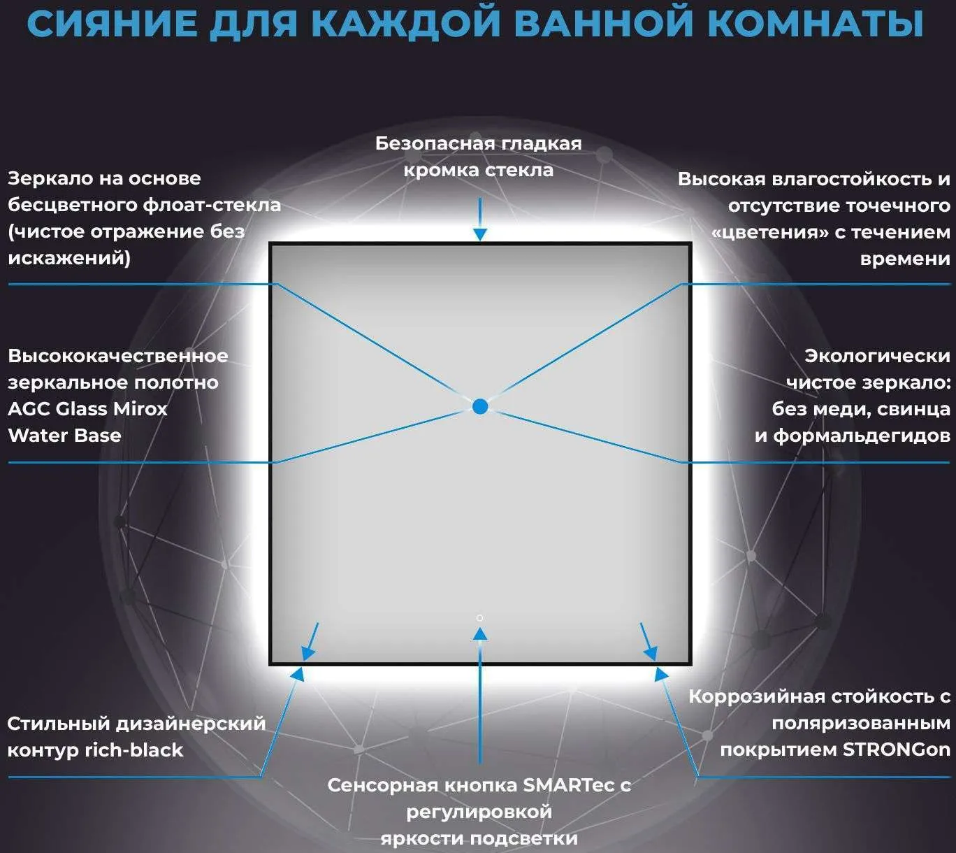 Безупречное японское стекло — результат непрерывного развития технологий, оно соответствует единой системе защиты от коррозии и отсутствию точечного «цветения» с течением времени. Периметр зеркального полотна декорирован тонким черным контуром, при облучении которого, отверждаемые УФ-чернила значительно повышают прочность сцепления.